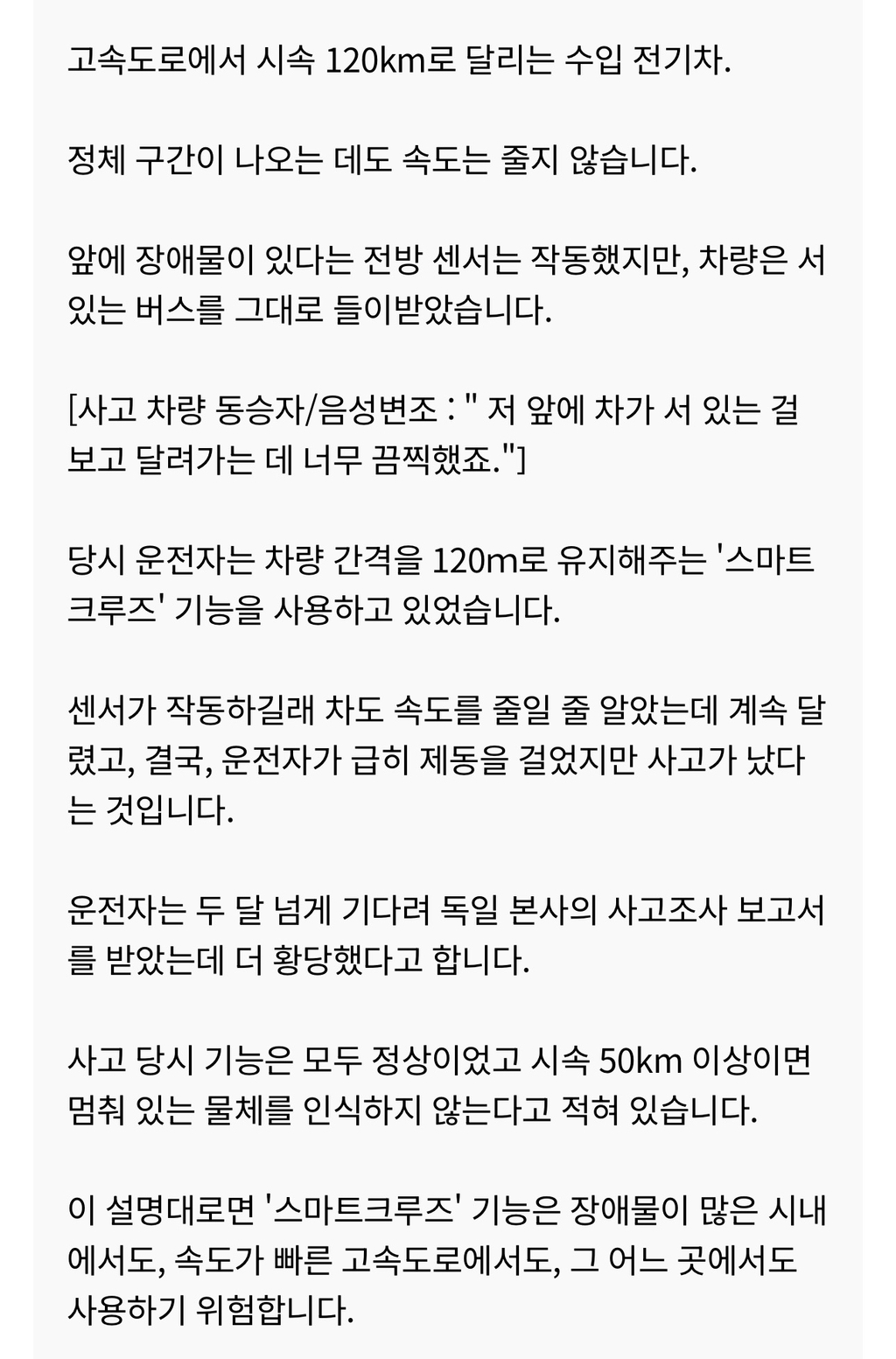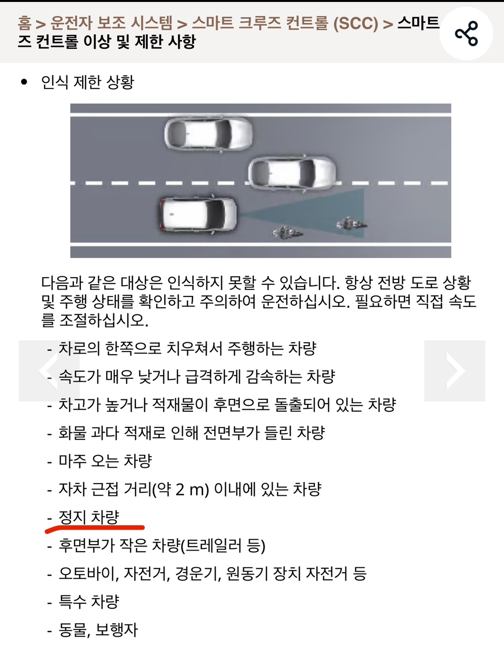 앞 차와의 거리 인식해서 자동으로 가속, 감속, 정지 하는 기능인데 정차중인 차나 사물은 인식하지 못할 수 있다는 치명적인 문제점이 있음.