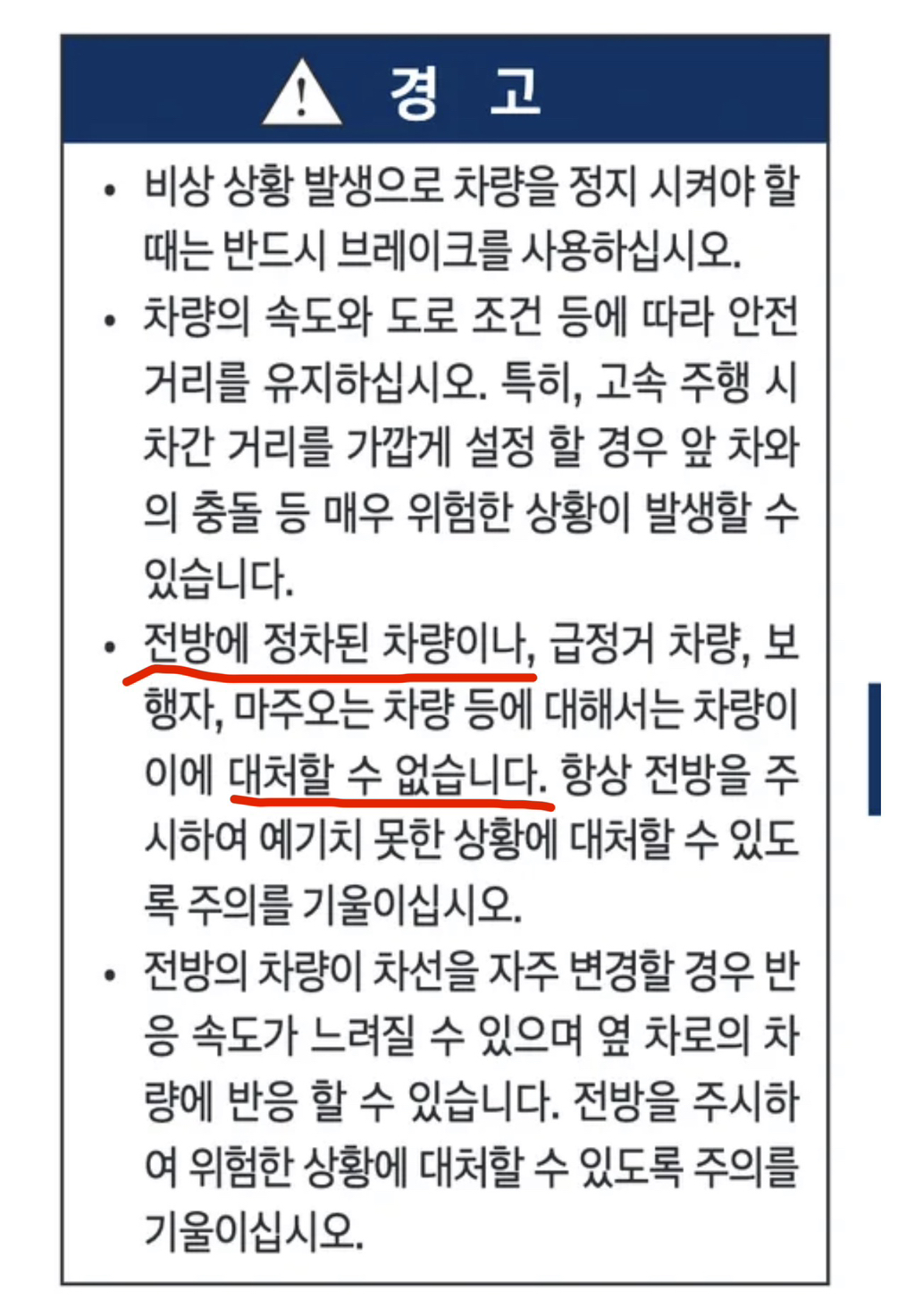 마치 총구가 사람을 향하지 말아야 하는게 기본 중의 기본인것처럼 주행보조 장치는 어디까지나 보조 장치고 기본은 전방주시하고 긴급상황에 대비해야 하는거 -