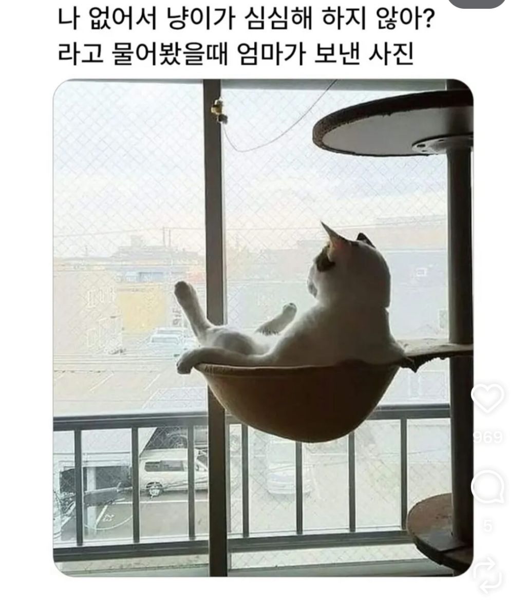 [동물]나 없어서 냥이가 심심해 하지 않냐고 엄마한테 물어봤더니 사진 보내줌 작성자러바오|작성시간26.01.06|조회수20,364 목록 댓글 8 글자크기 작게가 글자크기 크게가 다음검색 현재 게시글 추가 기능 열기 북마크 공유하기 신고 센터로 신고 댓글 댓글 8 댓글쓰기 답글쓰기 댓글 리스트 작성자Moonrise💙 | 작성시간 26.01.06 ㄱㅋㅋㅋㅋㅋㅋㅋ 작성자부산의전설77 | 작성시간 26.01.06 ㅋㅋㅋㅋㅋㅋㅋㅋㅋ 작성자tnatropmI | 작성시간 26.01.06 ㅋㅋㅋㅋㅋ 작성자Arsenal No.1 | 작성시간 26.01.06 ㅋㅋㅋㅋㅋㅋ 작성자고우림 | 작성시간 26.01.06 어~ 좋다~ 댓글 전체보기