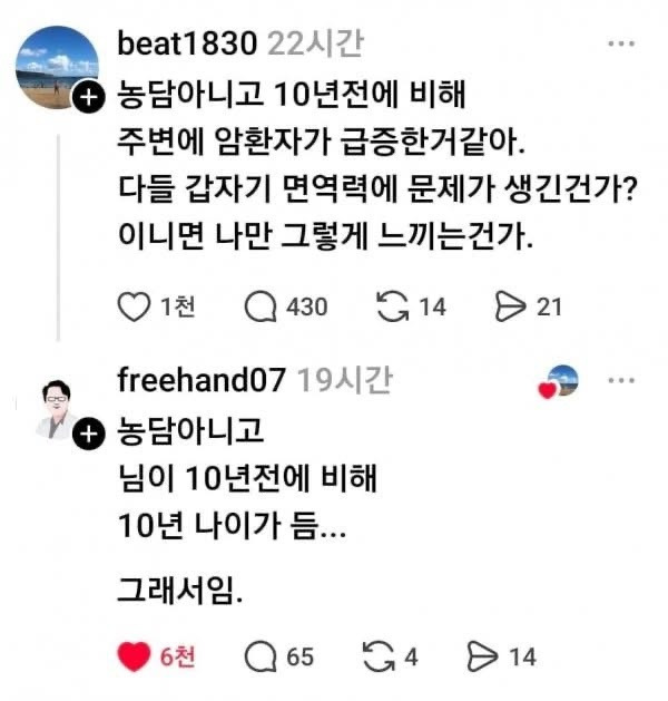 10년 전에 비해 암환자가 급증한 것 같아 작성자가을날4|작성시간26.01.06|조회수18,862 목록 댓글 3 글자크기 작게가 글자크기 크게가 다음검색 현재 게시글 추가 기능 열기 북마크 공유하기 신고 센터로 신고 댓글 댓글 3 댓글쓰기 답글쓰기 댓글 리스트 작성자지옥불 | 작성시간 26.01.06 이런거보면 자기 주변이나 스스로 겪는일을 통계적인 사실이라고 1차원적으로 생각하는사람들이 있긴한듯 답댓글 작성자김건희 | 작성시간 26.01.06 주변미터 ㄷㄷ 답댓글 작성자남의아저씨 | 작성시간 26.01.06 근데 10년 나이를 먹으면 주변사람들도 10년 나이를 먹고 암환자 발생이 많아 지는건 사실이죠ㅎ 댓글 전체보기