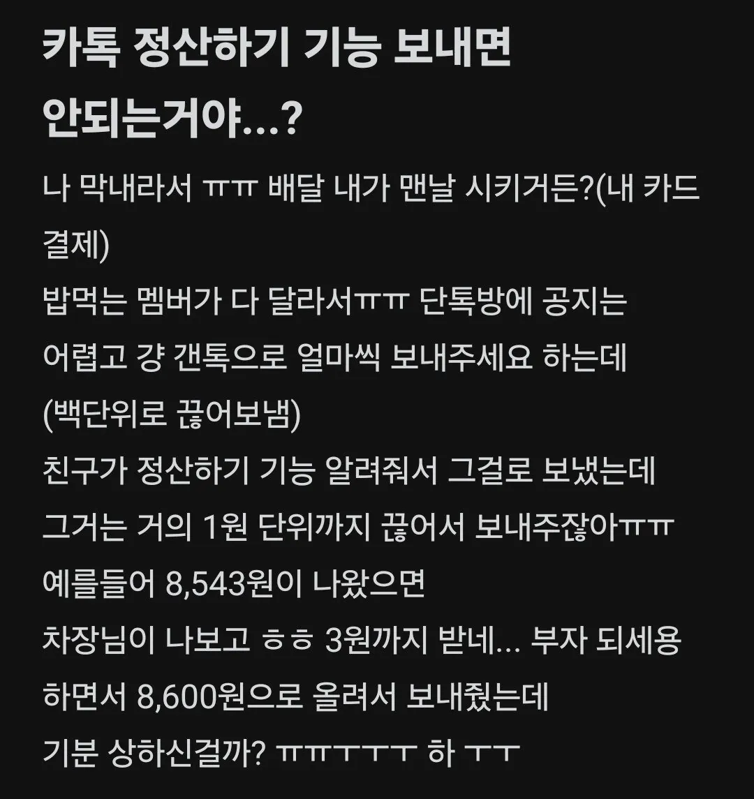근데, 나는 다르게.. 내가 원단위면 올려쳐서 줄라하는데, 특정모임에서 ㅡ.ㅡ 맨날 자기 카드깡 떄문에 하는분 있는데,