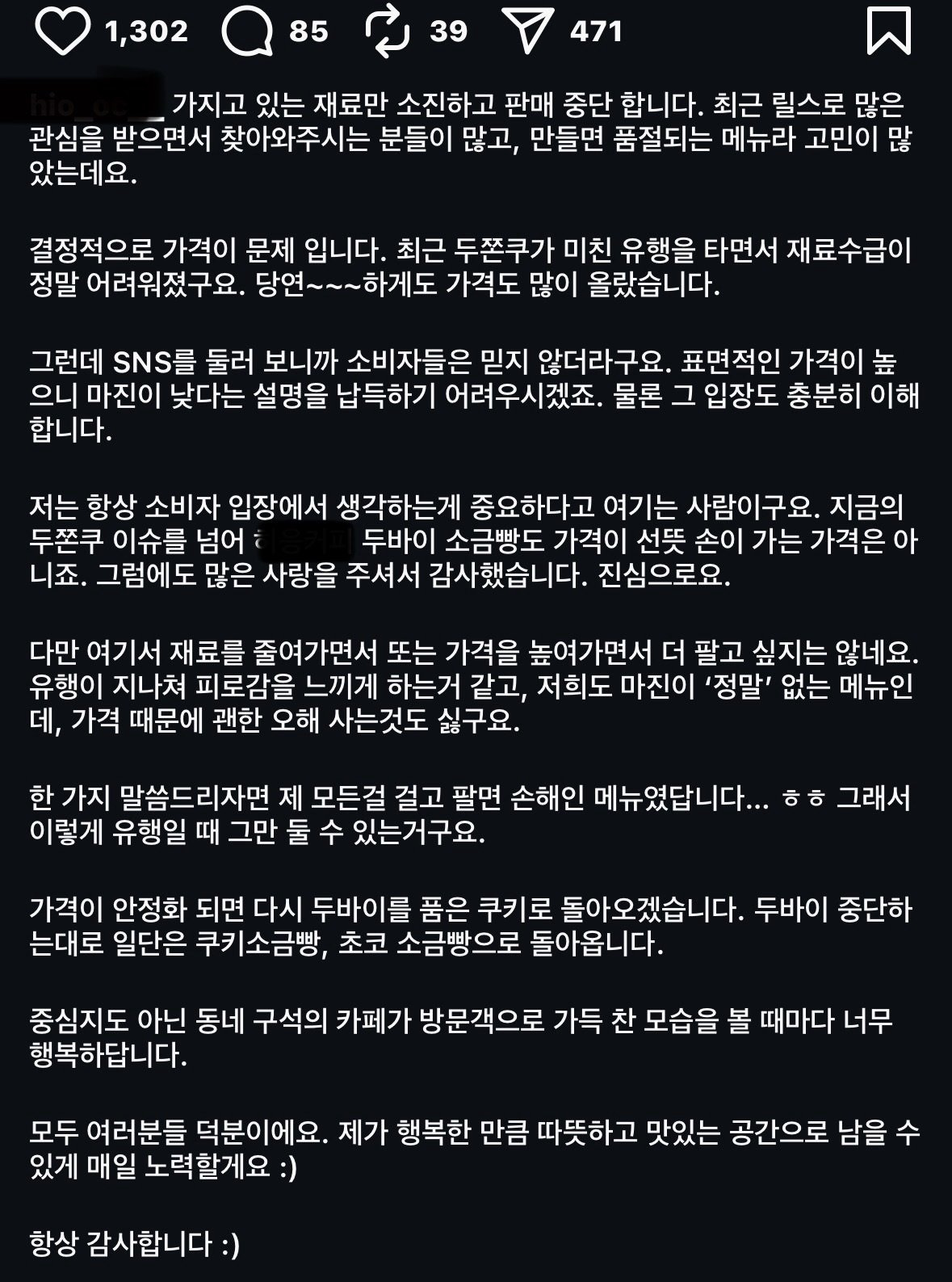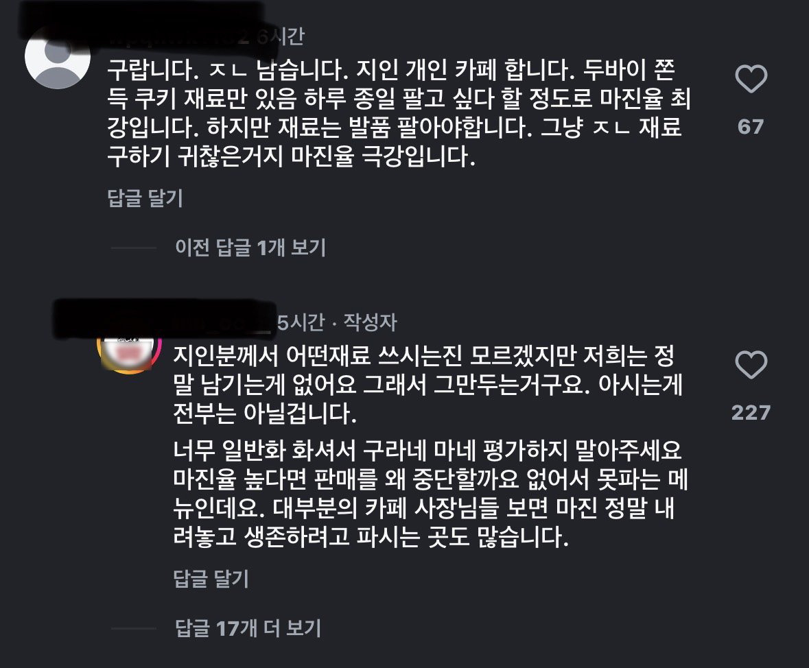 작성자움프 작성시간 26.01.06 손해보고 팔았다는건 거짓말이고 그냥 만들기도 귀찮고 점점 재료값도 오르고 구하기도 힘들어지니까 그만두는걸거에요 원가 비싸게 쳐도 3000~4000원이고 판매가는 6000~9000원이라