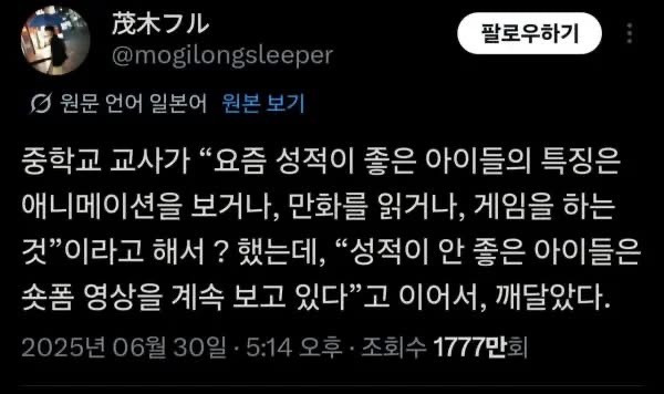 중학교 교사가 말하는 요즘 성적 좋은 아이들 특 작성자가을날4|작성시간26.01.06|조회수56,115 목록 댓글 6 글자크기 작게가 글자크기 크게가 다음검색 현재 게시글 추가 기능 열기 북마크 공유하기 신고 센터로 신고 댓글 댓글 6 댓글쓰기 답글쓰기 댓글 리스트 작성자Left foot | 작성시간 26.01.06 숏폼보고 팝콘브레인되면 뇌가 쪼그라드는듯 작성자갰랍랍 | 작성시간 26.01.06 아이들에게 백해무익한거 두개 꼽으면담배랑 쇼츠 작성자독거노인 | 작성시간 26.01.06 근데 애들뿐만 아니라 우리도 점점 ㅠㅠ 작성자아메리카노 | 작성시간 26.01.06 ㄷㄷ 작성자중고차파괴자 | 작성시간 26.01.07 말하는거보면 알죠 댓글 전체보기