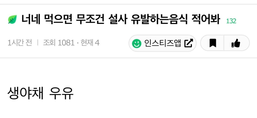 [기타]너네 먹으면 무조건 설사 유발하는 음식 적어봐 작성자정예린|작성시간26.01.06|조회수6,081 목록 댓글 44 글자크기 작게가 글자크기 크게가 출처 인스티즈 다음검색 현재 게시글 추가 기능 열기 북마크 공유하기 신고 센터로 신고 댓글 댓글 44 댓글쓰기 답글쓰기 댓글 리스트 작성자인유특전대 | 작성시간 26.01.07 산낙지 굴 작성자보건복지부 | 작성시간 26.01.07 돌체라떼 작성자평양박치기 | 작성시간 26.01.07 장어 작성자다비치 | 작성시간 26.01.07 군대리아 작성자흑흑맛있었다오늘밥은 | 작성시간 26.01.08 술 댓글 전체보기