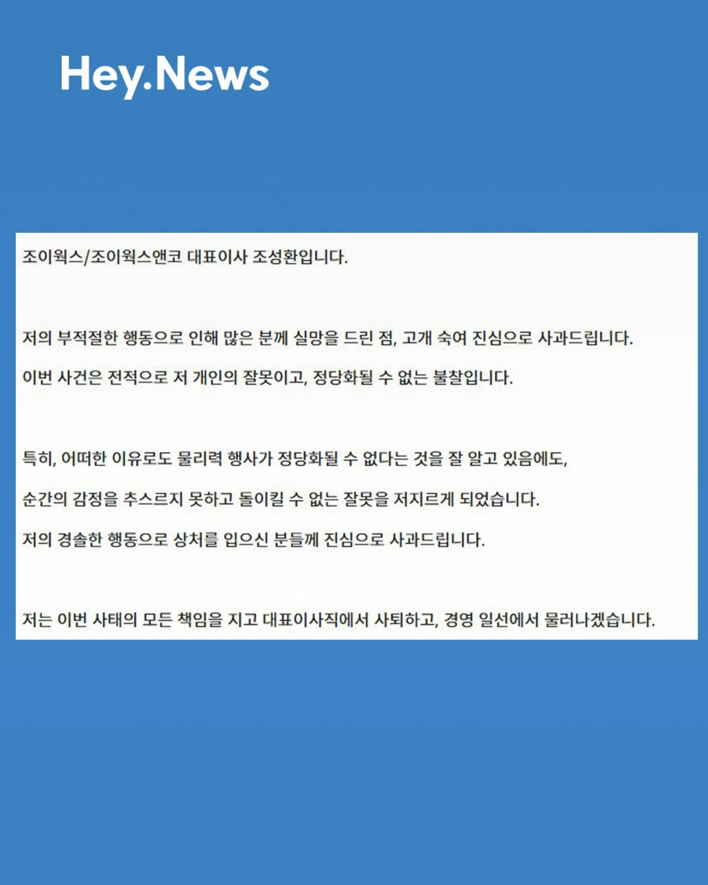 이 대표는 하청업체에서 허위사실을 유포해 이를 제지하는 과정에서 양측 모두 피해를 입은 쌍방 폭행이 일어났다 주장했으나 불매 운동 조짐까지 보여지자 결국 사퇴
