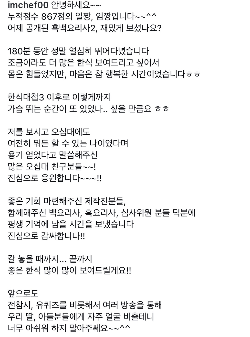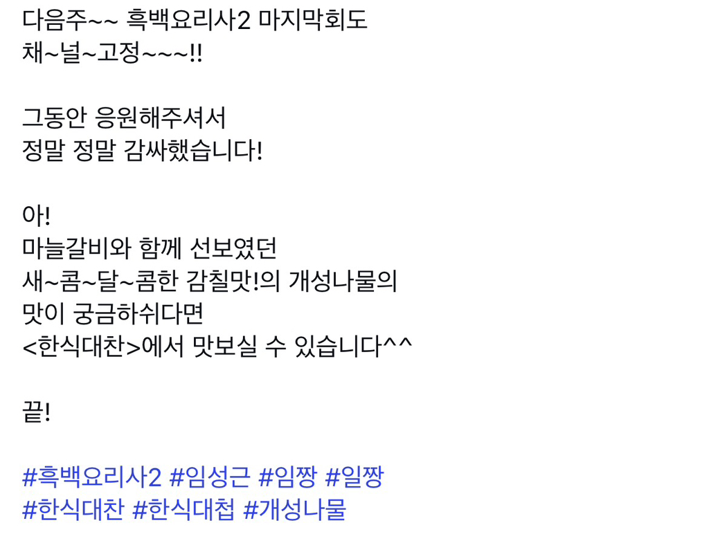 [SNS]흑백요리사2) (강스포) ‘아재맹수’ 임성근 셰프님 인스타그램 작성자인천제로콜라|작성시간26.01.07|조회수3,041 목록 댓글 17 글자크기 작게가 글자크기 크게가 요란스럽지만 멋있고 존경스럽습니다!냉부에서도 봬요~ 다음검색 현재 게시글 추가 기능 열기 북마크 공유하기 신고 센터로 신고 댓글 댓글 17 댓글쓰기 답글쓰기 댓글 리스트 작성자캐스커 | 작성시간 26.01.07 전참시랑 유퀴즈에 캐스팅 됐나봐요 ㄷㄷㄷ 작성자nananana | 작성시간 26.01.07 지난시즌 우승 맛피자보다 에드워드리의 스토리텔링이 주목 되었듯 이번 시즌은 임짱이 가장 기억에 남을듯 ㅋ 작성자송가인 | 작성시간 26.01.07 개멋있음ㅋㅋ 작성자텔피 | 작성시간 26.01.07 덕분에 궁중음식 구경했네요 임짱최고 작성자onestar | 작성시간 26.01.08 ㅋㅋㅋㄱㄱㄱ 댓글 전체보기