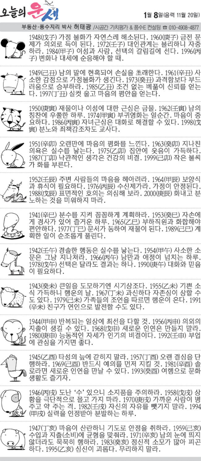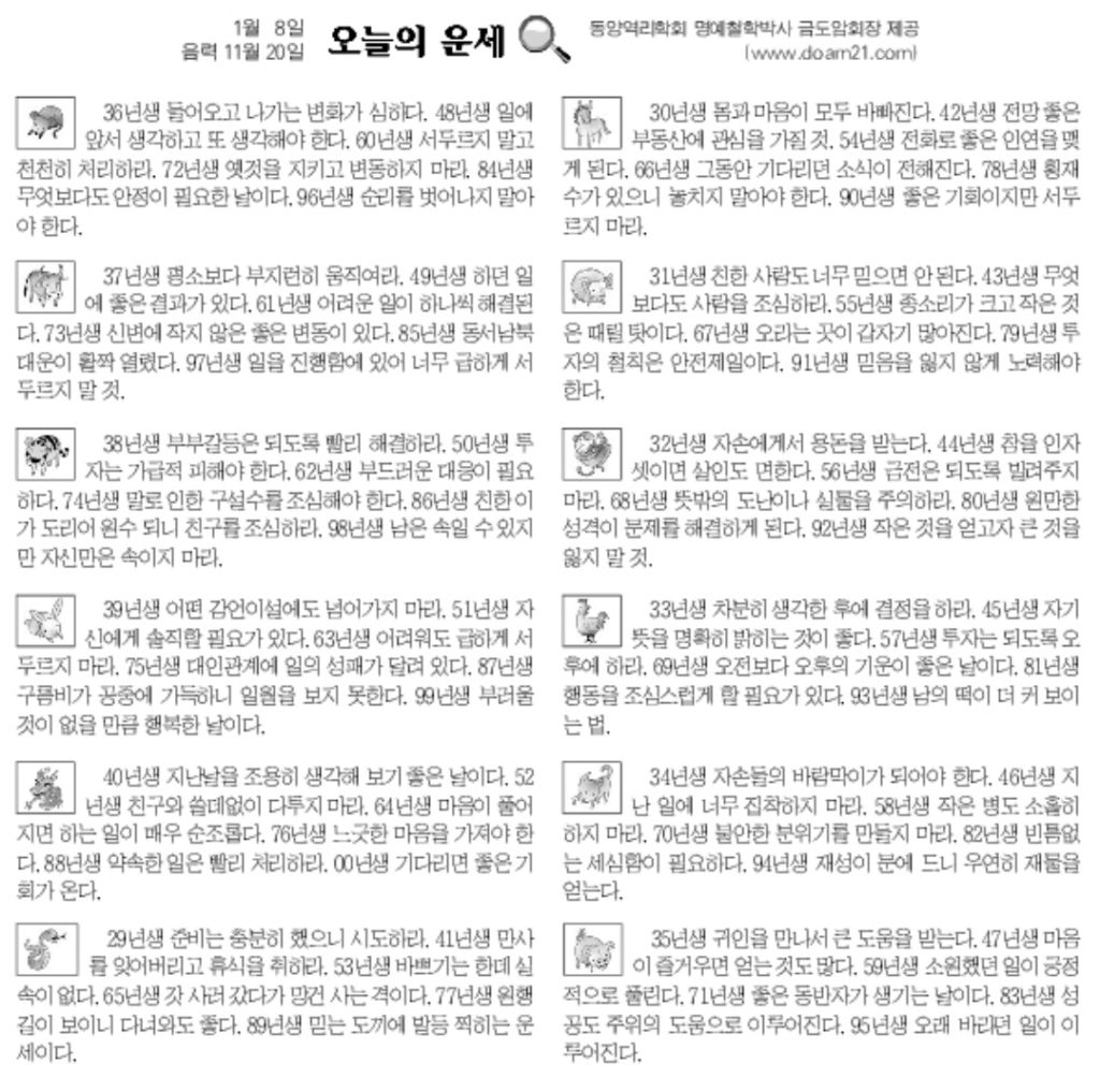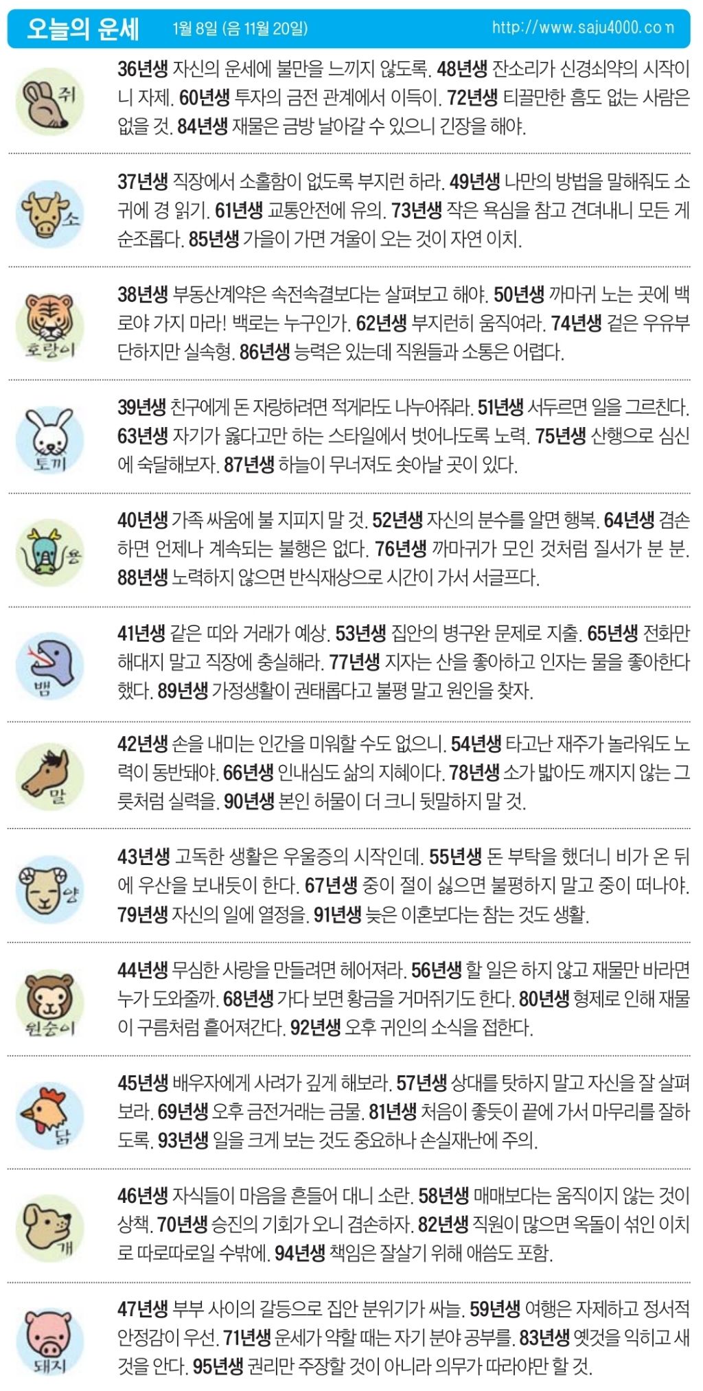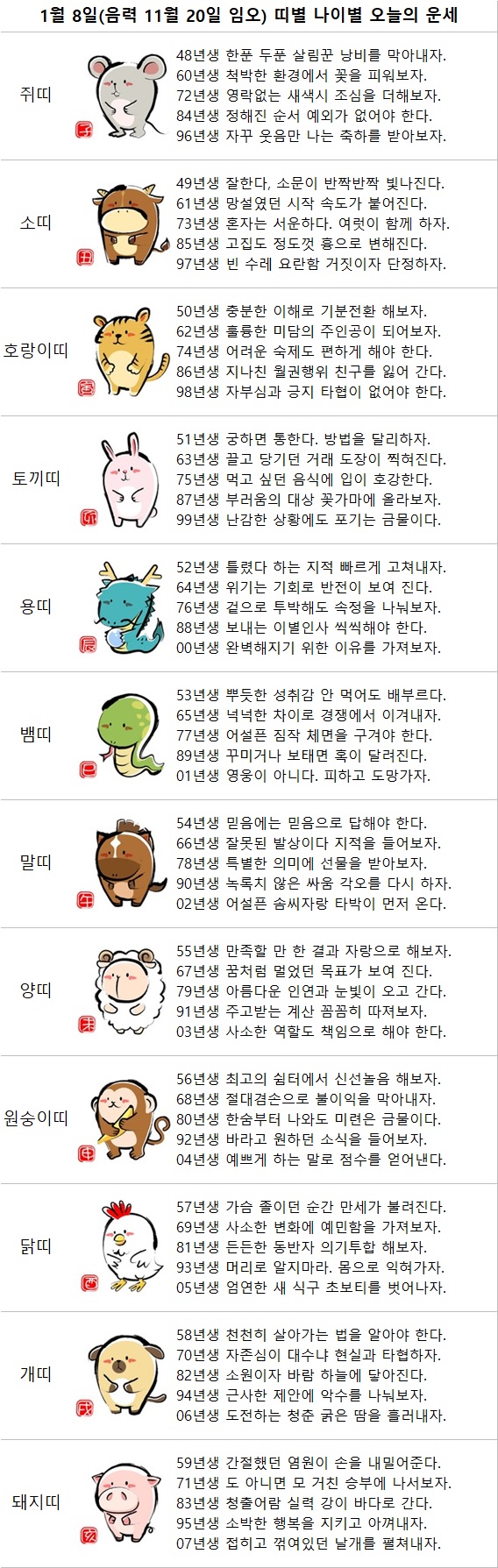 1월 8일 목요일 오늘의 운세 작성자난누군가또여긴어딘가.|작성시간26.01.08|조회수3,685 목록 댓글 11 글자크기 작게가 글자크기 크게가 다음검색 현재 게시글 추가 기능 열기 북마크 공유하기 신고 센터로 신고 댓글 댓글 11 댓글쓰기 답글쓰기 댓글 리스트 작성자수원블루맨1 | 작성시간 26.01.08 복채요 작성자정예린 | 작성시간 26.01.08 복채요 작성자곰팅이닷 | 작성시간 26.01.08 복채요 작성자5홉니다 | 작성시간 26.01.08 복채요 작성자이나경 | 작성시간 26.01.08 복채욥 댓글 전체보기