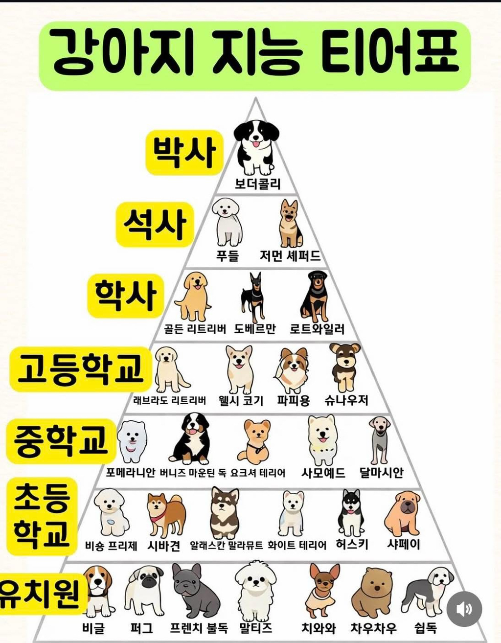 재미로 보는 강아지 지능 티어표 작성자가을날4|작성시간26.01.08|조회수6,613 목록 댓글 13 글자크기 작게가 글자크기 크게가 다음검색 현재 게시글 추가 기능 열기 북마크 공유하기 신고 센터로 신고 댓글 댓글 13 댓글쓰기 답글쓰기 댓글 리스트 작성자보건복지부 | 작성시간 26.01.08 골든이 랩보다 높다고? 작성자Noel Gallagher | 작성시간 26.01.08 셰퍼드 키워 보고싶음 작성자Tensegrity Universe and Philosophy | 작성시간 26.01.08 보리꼬리 너 마저 작성자Evan | 작성시간 26.01.08 보더콜리는 진짜 똑똑함. 토이푸들 키우고있는데 영리하다 못해 깍쟁이임 눈치가 너무빠름 작성자아메리카노 | 작성시간 26.01.08 오호 댓글 전체보기