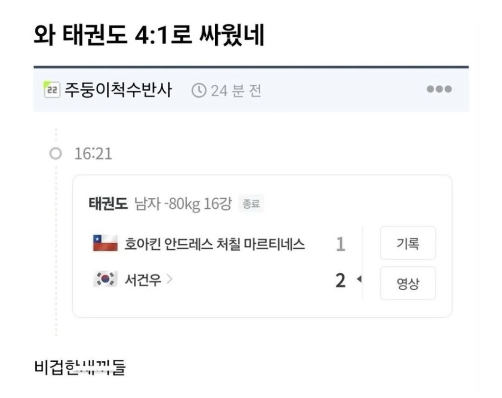 [유머]1대 4로 싸워서 이긴 태권도선수 작성자한로로로|작성시간26.01.08|조회수18,344 목록 댓글 12 글자크기 작게가 글자크기 크게가 대회인데 1대4;; 다음검색 현재 게시글 추가 기능 열기 북마크 공유하기 신고 센터로 신고 댓글 댓글 12 댓글쓰기 답글쓰기 댓글 리스트 작성자Elon Musk | 작성시간 26.01.08 ㅋㅋㅋ 누가1점이라도내서 0봉패는 아니네 작성자정예린 | 작성시간 26.01.08 ㄷㄷㄷ 작성자대한민국 축구 국가대표팀 | 작성시간 26.01.08 ㅋㅋㅋㅋㅋㅋㅋㅋ 작성자파란사과 | 작성시간 26.01.08 그래도 지네 ㅋㅋㅋ 작성자피버노바 | 작성시간 26.01.08 ㅋㅋㅋ 댓글 전체보기