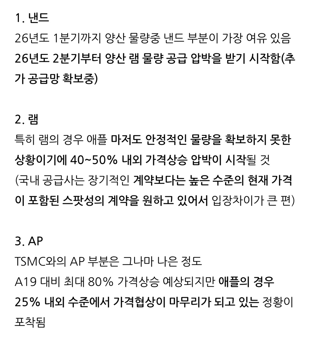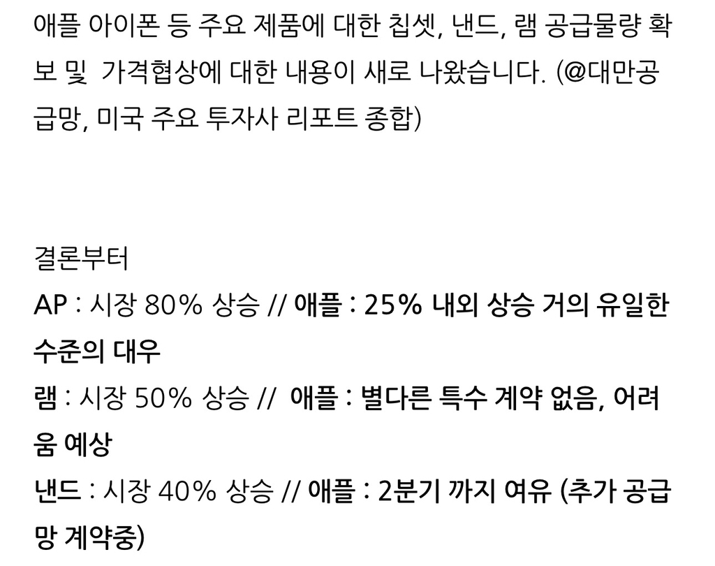 애플 26년도 AP, NAND, DRAM 공급물량 및 가격협상 내용 작성자Google|작성시간26.01.08|조회수2,417 목록 댓글 2 글자크기 작게가 글자크기 크게가 https://m.blog.naver.com/PostView.naver?blogId=yeux1122&logNo=224138727226&navType=by나름 선방중하지만 램은 애플도 확보 못함 다음검색 현재 게시글 추가 기능 열기 북마크 공유하기 신고 센터로 신고 댓글 댓글 2 댓글쓰기 답글쓰기 댓글 리스트 작성자키키 | 작성시간 26.01.08 아이패드 더 미루지 말고 지금 사야되나.. 작성자시티즌 유 | 작성시간 26.01.08 아 폰 바꿔야되나 댓글 전체보기