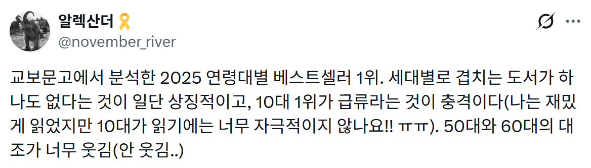 [기타]교보문고 2025 연령대별 베스트셀러 1위 도서들 작성자서스날|작성시간26.01.08|조회수6,019 목록 댓글 8 글자크기 작게가 글자크기 크게가 다음검색 현재 게시글 추가 기능 열기 북마크 공유하기 신고 센터로 신고 댓글 댓글 8 댓글쓰기 답글쓰기 댓글 리스트 작성자오스카 아이작 | 작성시간 26.01.08 급류 모순 결국 국민이 합니다이렇게 읽었네요 작성자피카츄 | 작성시간 26.01.08 한동훈 ㅋㅋㅋㅋㅋㅋㅋㅋ 작성자노가타무비자 | 작성시간 26.01.08 급류 모순 소년이온다 작성자골디락스 | 작성시간 26.01.08 혼모노 읽어봤는데 그저 그렇던데 작성자즈믄가람 | 작성시간 26.01.08 모순 진짜 대출 많이 나가긴 함. 댓글 전체보기