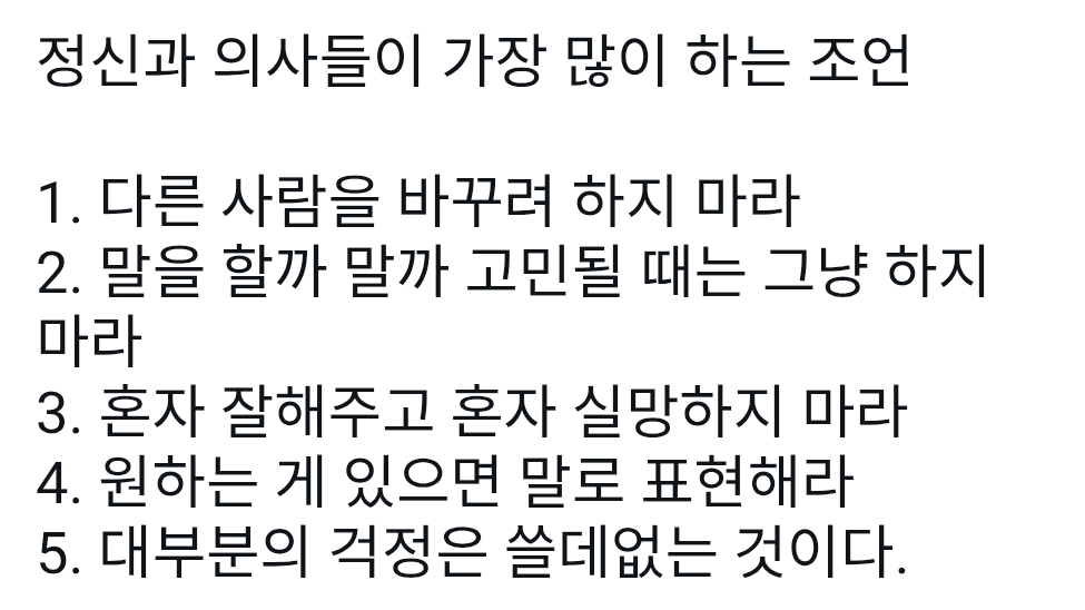 정신과 의사들이 가장 많이 하는 조언 작성자러바오|작성시간26.01.09|조회수10,178 목록 댓글 4 글자크기 작게가 글자크기 크게가 다음검색 현재 게시글 추가 기능 열기 북마크 공유하기 신고 센터로 신고 댓글 댓글 4 댓글쓰기 답글쓰기 댓글 리스트 작성자갰랍랍 | 작성시간 26.01.09 불교에서도 이야기하는 부분들 작성자롭슨 | 작성시간 26.01.09 다 맞는말 개인적으로 5번은 진짜 쉽지않음 ㅠㅠ 작성자집중하는시간 | 작성시간 26.01.09 진짜 이건 저장해야겠다 작성자Cole Jermaine Palmer | 작성시간 26.01.09 와드 댓글 전체보기