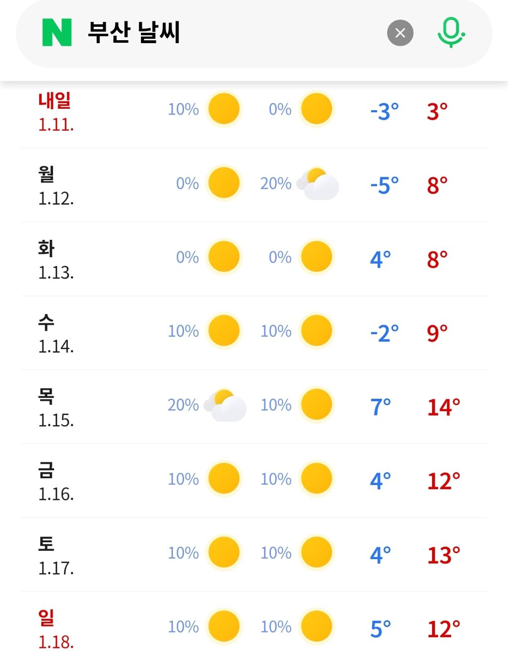[정보]다음주 서울/부산 날씨 작성자한교동|작성시간26.01.10|조회수8,967 목록 댓글 7 글자크기 작게가 글자크기 크게가 다음검색 현재 게시글 추가 기능 열기 북마크 공유하기 신고 센터로 신고 댓글 댓글 7 댓글쓰기 답글쓰기 댓글 리스트 작성자별일아님 | 작성시간 26.01.10 부산은 벌써 봄이네 작성자Andrea Pirlo 21 | 작성시간 26.01.10 ㄷㄷ 작성자정예린 | 작성시간 26.01.10 ㄷㄷㄷ 작성자라일라일 | 작성시간 26.01.10 분명 이러고 1월 말에 한파옴ㅋㅋ 작성자라파엘나달 | 작성시간 26.01.10 부산은 반팔 입나요? 댓글 전체보기