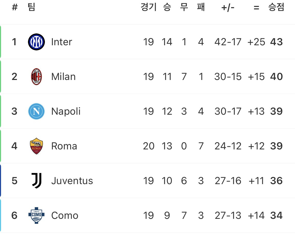 현재 세리에A 우승경쟁 ㄷㄷㄷ 작성자CokeR|작성시간26.01.12|조회수5,632 목록 댓글 10 글자크기 작게가 글자크기 크게가 다음검색 현재 게시글 추가 기능 열기 북마크 공유하기 신고 센터로 신고 댓글 댓글 10 댓글쓰기 답글쓰기 댓글 리스트 작성자Totti | 작성시간 26.01.12 로마 왜 높아 작성자고우림 | 작성시간 26.01.12 한경기 삐끗하는 순간 바로 뒤바뀌거나 쫓기거나ㄷㄷ 작성자HonjoSuzu | 작성시간 26.01.12 Como estas ㄷㄷ 작성자인천촌놈 | 작성시간 26.01.12 세스크도 감독으로서 꽃이 피려나보네요. 코모 꾸준히 잘하고있네 작성자jangs | 작성시간 26.01.12 와 코모 뭔데 ㄷㄷ 댓글 전체보기
