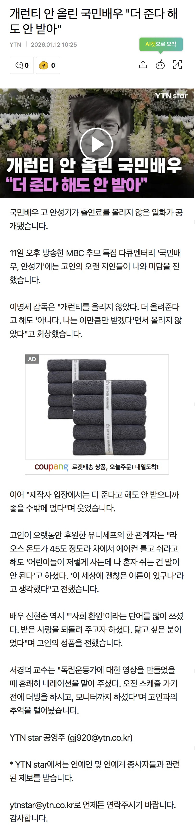 [기사]개런티 안 올린 국민배우 "더 준다 해도 안 받아" 작성자CokeR|작성시간26.01.12|조회수9,812 목록 댓글 6 글자크기 작게가 글자크기 크게가 https://m.news.nate.com/view/20260112n10203?mid=e01&list=recent&cpcd=개런티 안 올린 국민배우 "더 준다 해도 안 받아" : 네이트 연예한눈에 보는 오늘 : 연예가 화제 - 뉴스 : 국민배우 고 안성기가 출연료를 올리지 않은 일화가 공개됐습니다. 11일 오후 방송한 MBC 추모 특집 다큐멘터리 '국민배우, 안성기'에는 고인의 오랜 지인m.news.nate.com 다음검색 현재 게시글 추가 기능 열기 북마크 공유하기 신고 센터로 신고 댓글 댓글 6 댓글쓰기 답글쓰기 댓글 리스트 작성자다현 | 작성시간 26.01.12 삼가 고인의 명복을 빕니다. 작성자오스먼트 | 작성시간 26.01.12 정말 훌륭하신 분.. 작성자독거노인 | 작성시간 26.01.12 배우로서나 인간적으로서나 존경받으실만한 분.. 작성자베토벤 | 작성시간 26.01.12 많이 존경받으신 분이셨구나..ㅠㅠ 작성자영원한 캡틴박 | 작성시간 26.01.13 고인의 명복을 빕니다 댓글 전체보기