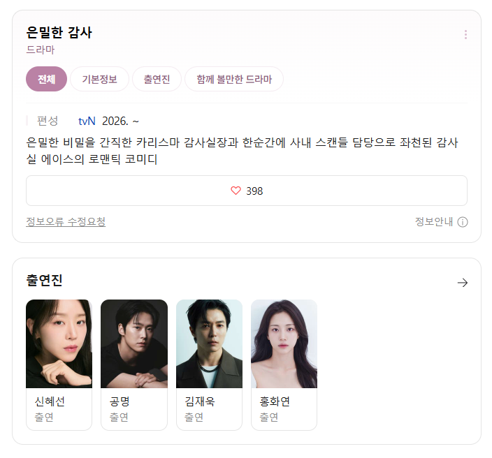 공동 4위 tvN 은밀한 감사 (신혜선, 공명, 김재욱, 홍화연) 3표