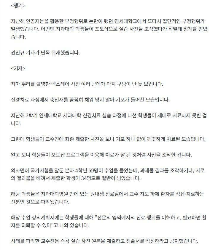 [기사][단독] "예비 치과의사들이 단체로" 충격…실습 사진의 진실 작성자음교수2|작성시간26.01.12|조회수7,089 목록 댓글 6 글자크기 작게가 글자크기 크게가 https://n.news.naver.com/mnews/article/055/0001323641?sid=102 다음검색 현재 게시글 추가 기능 열기 북마크 공유하기 신고 센터로 신고 댓글 댓글 6 댓글쓰기 답글쓰기 댓글 리스트 작성자jose | 작성시간 26.01.13 미친... 작성자페르세우스 | 작성시간 26.01.13 고작 징계한게 근신2주 봉사활동 20시간 ㅋㅋㅋㅋ 장난하나 작성자맛있는 고로케 | 작성시간 26.01.13 저런 애들은 걍 퇴학시키면 안되냐? 작성자상큼상큼한시대 | 작성시간 26.01.13 돌았네..... 작성자I.B.I LUV | 작성시간 26.01.13 저러면 진짜 나중에 의사 되면 이빨 아작 내게 만들 것들인데.... 안돼 댓글 전체보기