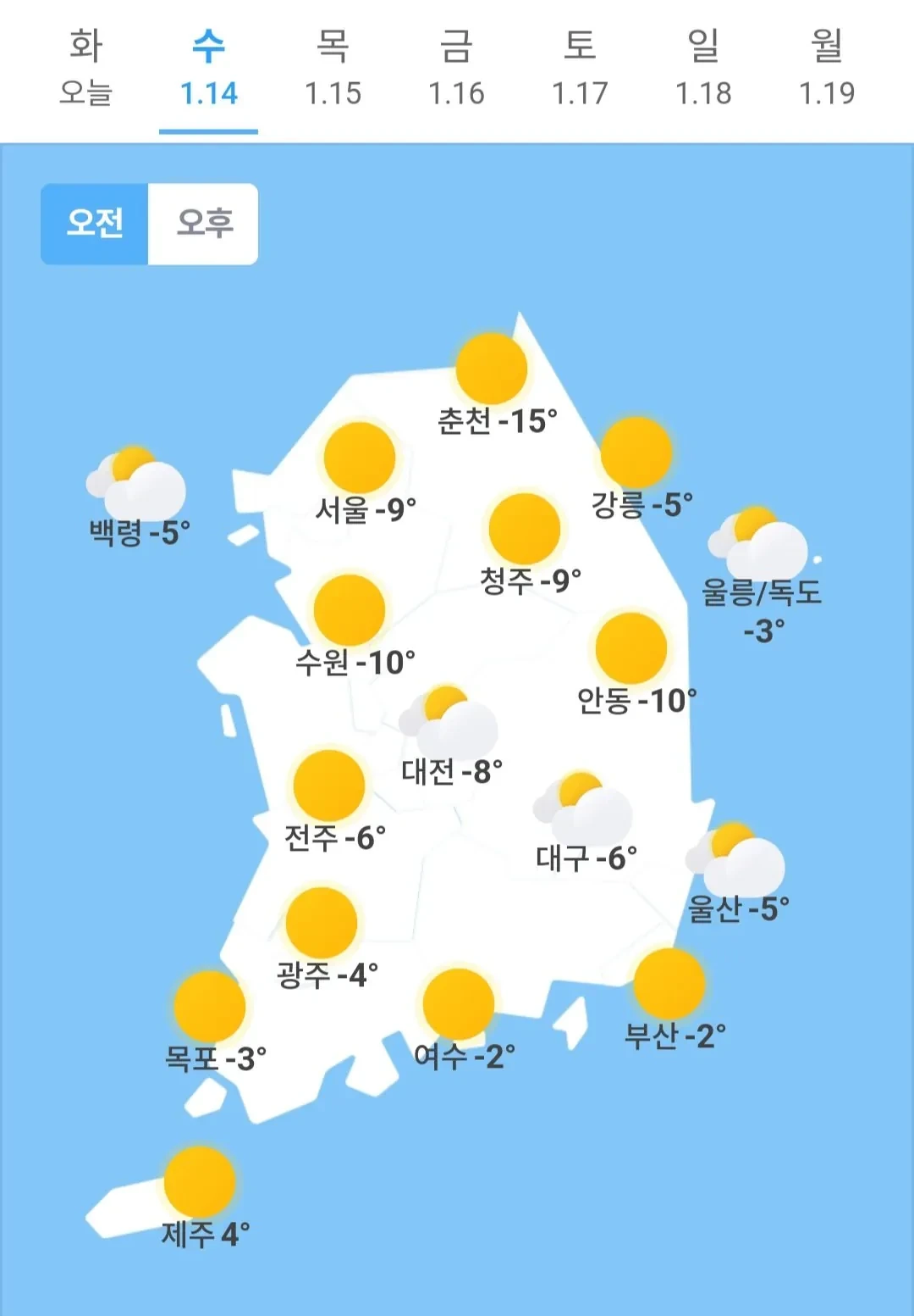 [기타]내일 아침 온도.. 작성자rade bogdanovic|작성시간26.01.13|조회수5,290 목록 댓글 11 글자크기 작게가 글자크기 크게가 다음검색 현재 게시글 추가 기능 열기 북마크 공유하기 신고 센터로 신고 댓글 댓글 11 댓글쓰기 답글쓰기 댓글 리스트 작성자이나경 | 작성시간 26.01.13 춥ㅠㅠ 작성자이재명정부 | 작성시간 26.01.13 작성자율이 | 작성시간 26.01.13 또 춥네... 작성자정예린 | 작성시간 26.01.13 작성자대피소장 | 작성시간 26.01.13 버스 내일도 안다니면 진짜 심각해질거 같은데 댓글 전체보기