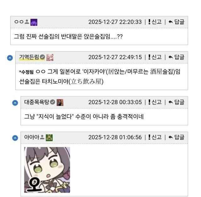 선술집의 뜻 작성자가을날4|작성시간26.01.13|조회수8,307 목록 댓글 13 글자크기 작게가 글자크기 크게가 다음검색 현재 게시글 추가 기능 열기 북마크 공유하기 신고 센터로 신고 댓글 댓글 13 댓글쓰기 답글쓰기 댓글 리스트 작성자똘끼타카 | 작성시간 26.01.13 선술집에서 살짝 마시던 게 잔술인가ㄷㄷ 작성자Xabi Alonso | 작성시간 26.01.13 서서갈비 작성자파밀밭의 호수꾼 | 작성시간 26.01.13 헐 작성자시릴라 | 작성시간 26.01.13 오 타치노미야 선술집 이자카야 앉술집 작성자William SALIBA | 작성시간 26.01.13 헐? 댓글 전체보기