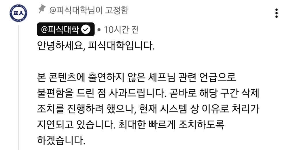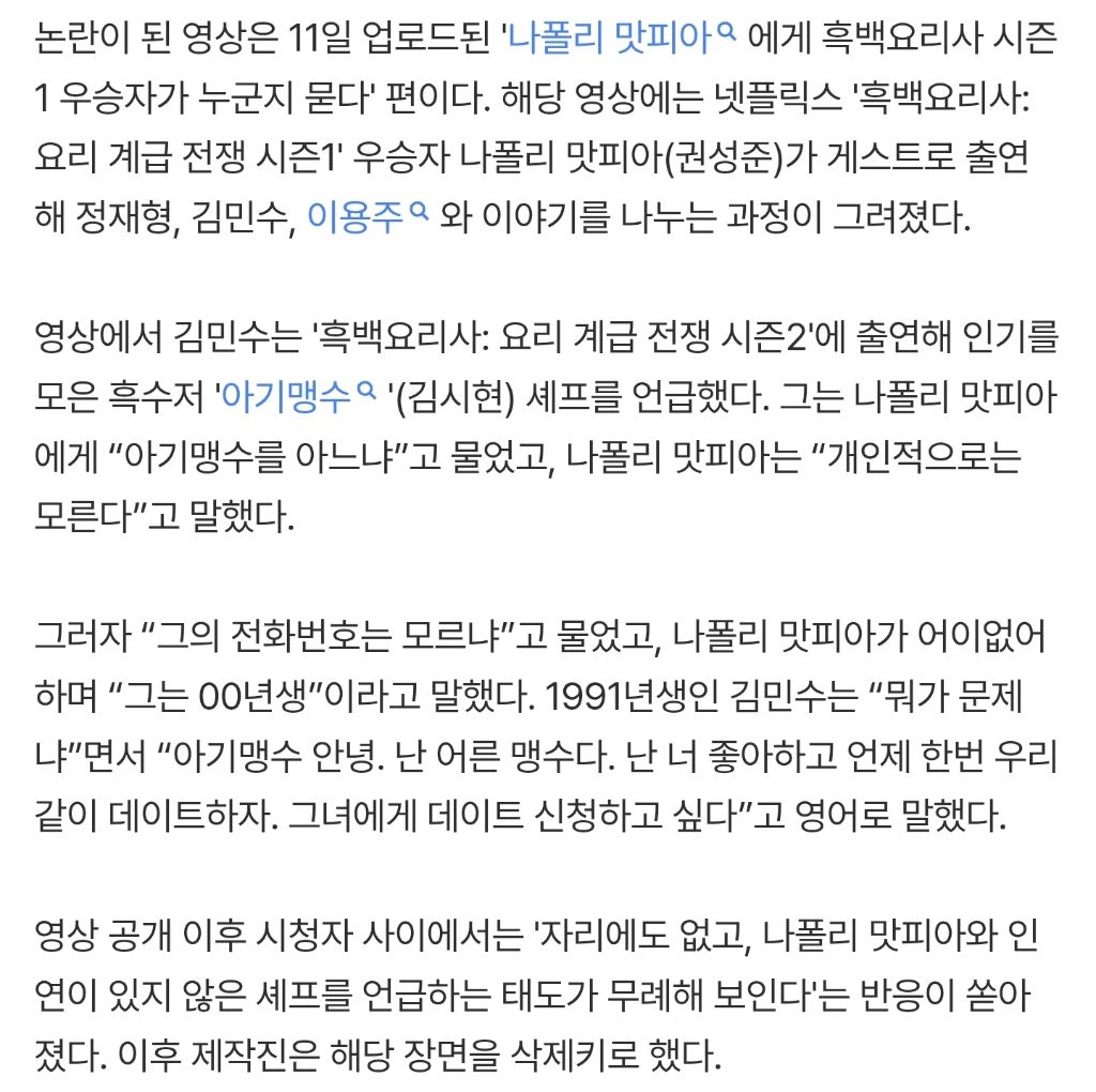 [연예]“아기맹수, 데이트하자”…'피식대학', 김민수 발언에 “삭제 조치” 작성자Hailee Steinfeld|작성시간26.01.13|조회수14,971 목록 댓글 62 글자크기 작게가 글자크기 크게가 https://m.entertain.naver.com/home/article/437/0000473171“아기맹수, 데이트하자”…'피식대학', 김민수 발언에 “삭제 조치”여기를 눌러 링크를 확인하세요m.entertain.naver.com 다음검색 현재 게시글 추가 기능 열기 북마크 공유하기 신고 센터로 신고 댓글 댓글 62 댓글쓰기 답글쓰기 댓글 리스트 작성자조영욱짱욱 | 작성시간 26.01.13 이건 불편러가 아니라 개뜬금이긴하네 작성자브론즈4 | 작성시간 26.01.13 개인적으로는 큰 문제 아니라고 생각함. 선을 넘었다 생각하는 사람들이 있으면 그 의견도 존중함 작성자하빵 | 작성시간 26.01.13 이해가 안감 작성자삑궷츢 | 작성시간 26.01.13 트위터발 억까에 너무 무릎 꿇네 작성자Michael essien | 작성시간 26.01.13 그을쎄 이게 논란까지...? 댓글 전체보기