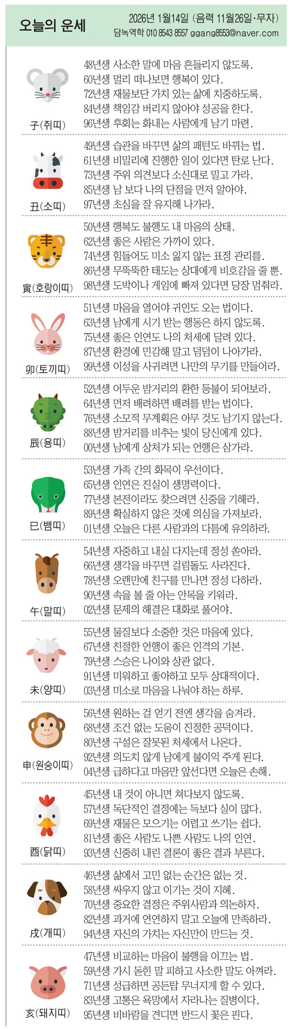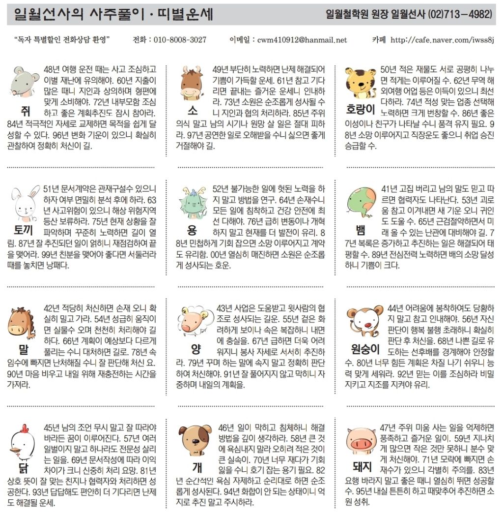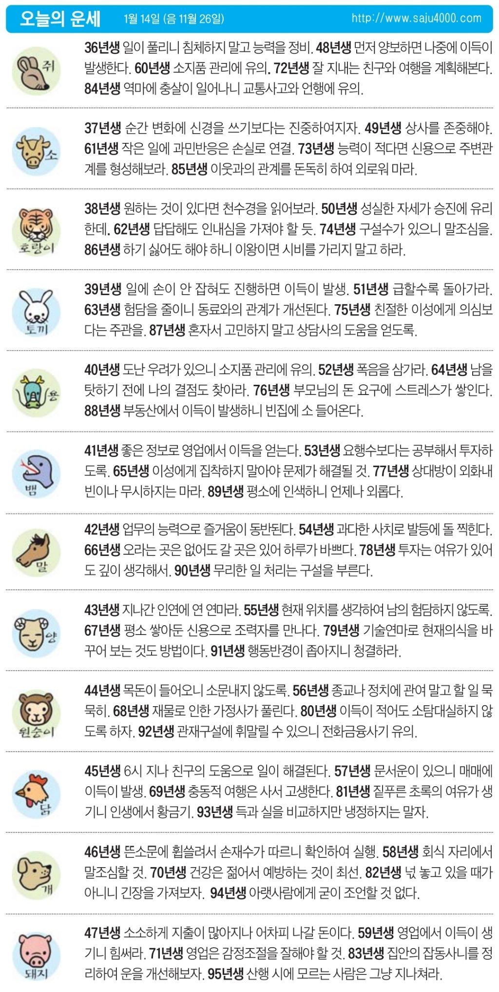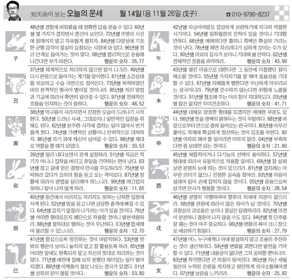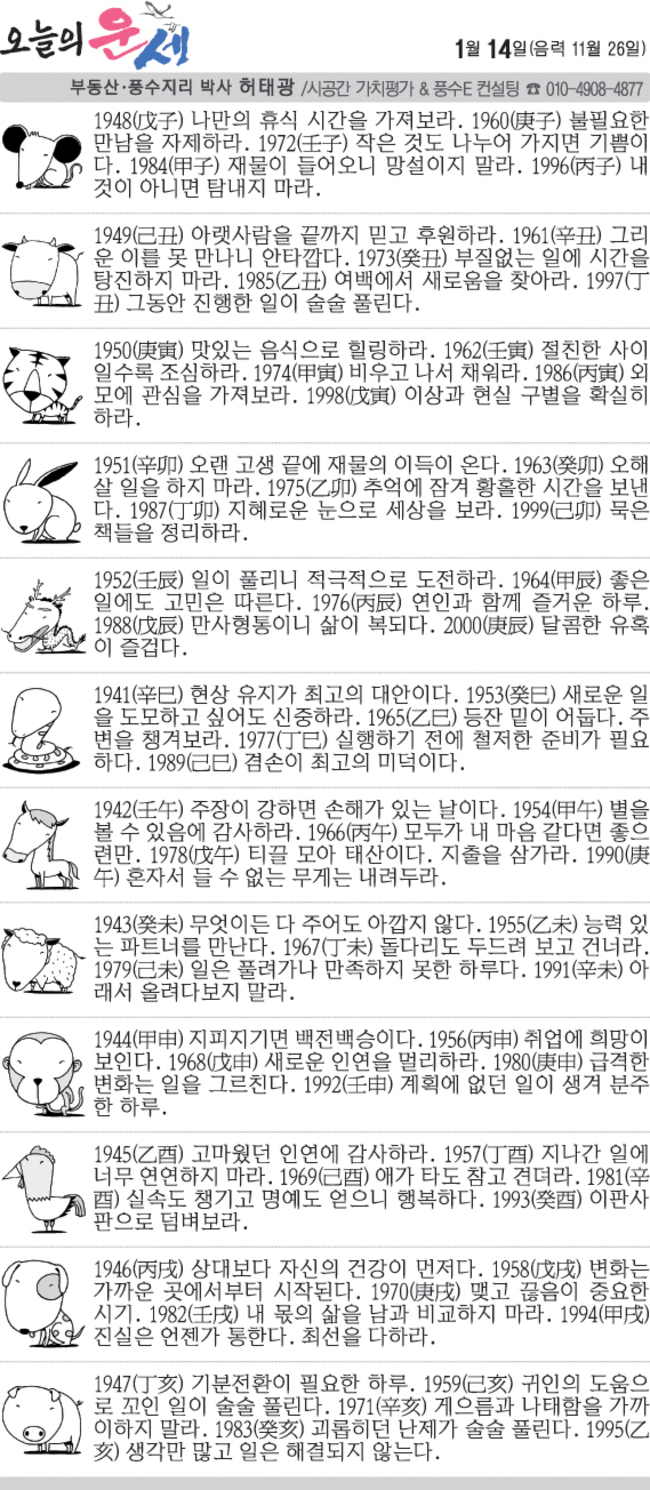 1월 14일 수요일 오늘의 운세 작성자난누군가또여긴어딘가.|작성시간26.01.14|조회수2,910 목록 댓글 13 글자크기 작게가 글자크기 크게가 다음검색 현재 게시글 추가 기능 열기 북마크 공유하기 신고 센터로 신고 댓글 댓글 13 댓글쓰기 답글쓰기 댓글 리스트 작성자수원블루맨1 | 작성시간 26.01.14 복채요 작성자부처님 | 작성시간 26.01.14 복채요! 작성자Amier | 작성시간 26.01.14 복채요 작성자정예린 | 작성시간 26.01.14 복채요! 작성자한화 이글스 | 작성시간 26.01.14 복채요 댓글 전체보기