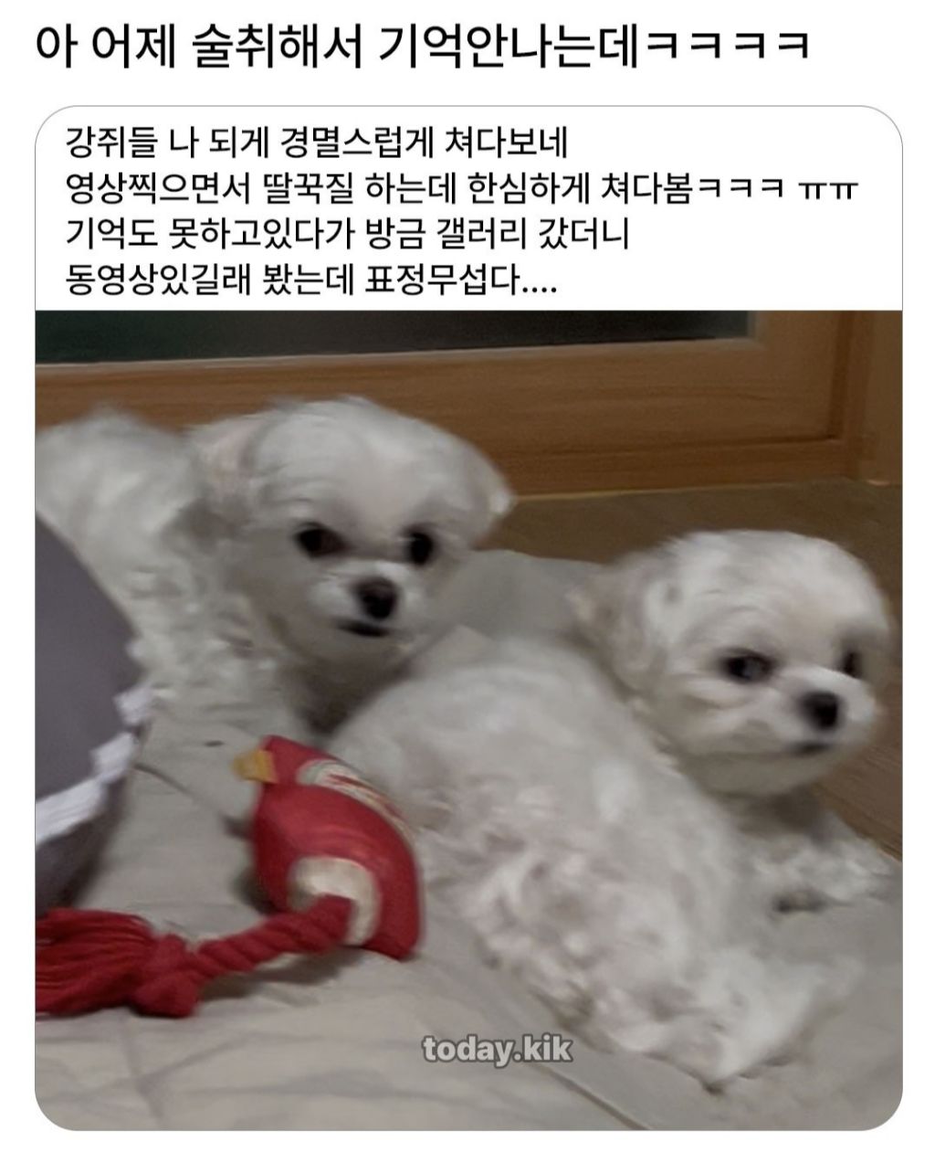 술먹고 들어왔더니 강아지들이 째려봐요 ㄷㄷ 작성자Tove Styrke|작성시간26.01.14|조회수3,458 목록 댓글 5 글자크기 작게가 글자크기 크게가 다음검색 현재 게시글 추가 기능 열기 북마크 공유하기 신고 센터로 신고 댓글 댓글 5 댓글쓰기 답글쓰기 댓글 리스트 작성자마일즈 모랄레스 | 작성시간 26.01.14 ㅋㅋㅋㅋㅋㅋㅋㅋ 작성자Andrea Pirlo 21 | 작성시간 26.01.14 ㅋㅋㅋㅋㅋㅋ 작성자무무링 | 작성시간 26.01.14 오른쪽앤 이미 해탈했나봐 ㅋㅋㅋㅋㅋ 작성자밀키스 | 작성시간 26.01.14 경멸ㅋㅋㅋㅋ 작성자이천이십이 | 작성시간 26.01.14 표정ㅋㅋㅋ 댓글 전체보기