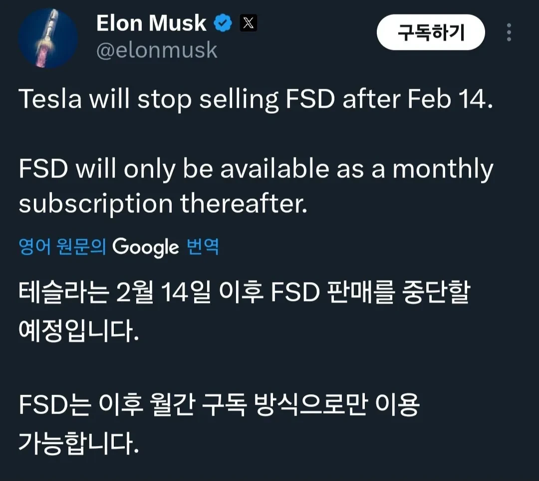 [SNS]일론 머스크: "2월 14일부터 fsd 월 구독제 전환" 작성자rade bogdanovic|작성시간26.01.14|조회수7,685 목록 댓글 3 글자크기 작게가 글자크기 크게가 다음검색 현재 게시글 추가 기능 열기 북마크 공유하기 신고 센터로 신고 댓글 댓글 3 댓글쓰기 답글쓰기 댓글 리스트 작성자Farrokh Bulsara | 작성시간 26.01.14 일단 들어오게 해서 나가지 못하게...데이터 수집에는 장난없겠군.. 답댓글 작성자rade bogdanovic 작성자 본인 여부 작성자 | 작성시간 26.01.14 900만원 부담스러운 사람들 맛보기 좋을듯.. 작성자디지몬 | 작성시간 26.01.14 월 얼마하려나 댓글 전체보기