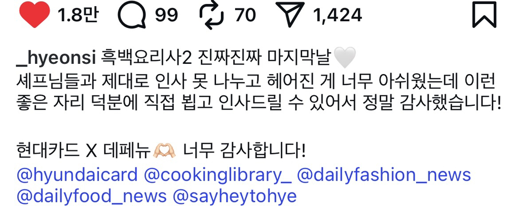 [SNS]흑백요리사2) ‘아기맹수’ 김시현 셰프 인스타 작성자인천제로콜라|작성시간26.01.14|조회수12,016 목록 댓글 18 글자크기 작게가 글자크기 크게가 데페뉴는 빨리 현장 영상 끓여와라!!근데 아기맹수 러블리! 다음검색 현재 게시글 추가 기능 열기 북마크 공유하기 신고 센터로 신고 댓글 댓글 18 댓글쓰기 답글쓰기 댓글 리스트 답댓글 작성자랩퍼싸박 | 작성시간 26.01.15 아기맹수요?? 답댓글 작성자삑궷츢 | 작성시간 26.01.15 랩퍼싸박 쌤쌤쌤 작성자똘끼타카 | 작성시간 26.01.15 브이 각도가 엄청나네ㄷㄷ 작성자박상미 | 작성시간 26.01.15 예쁘다 작성자Bad to the Bone | 작성시간 26.01.21 요리사라고 안 했으면 아이돌이나 배우인 줄 알겠음. 댓글 전체보기