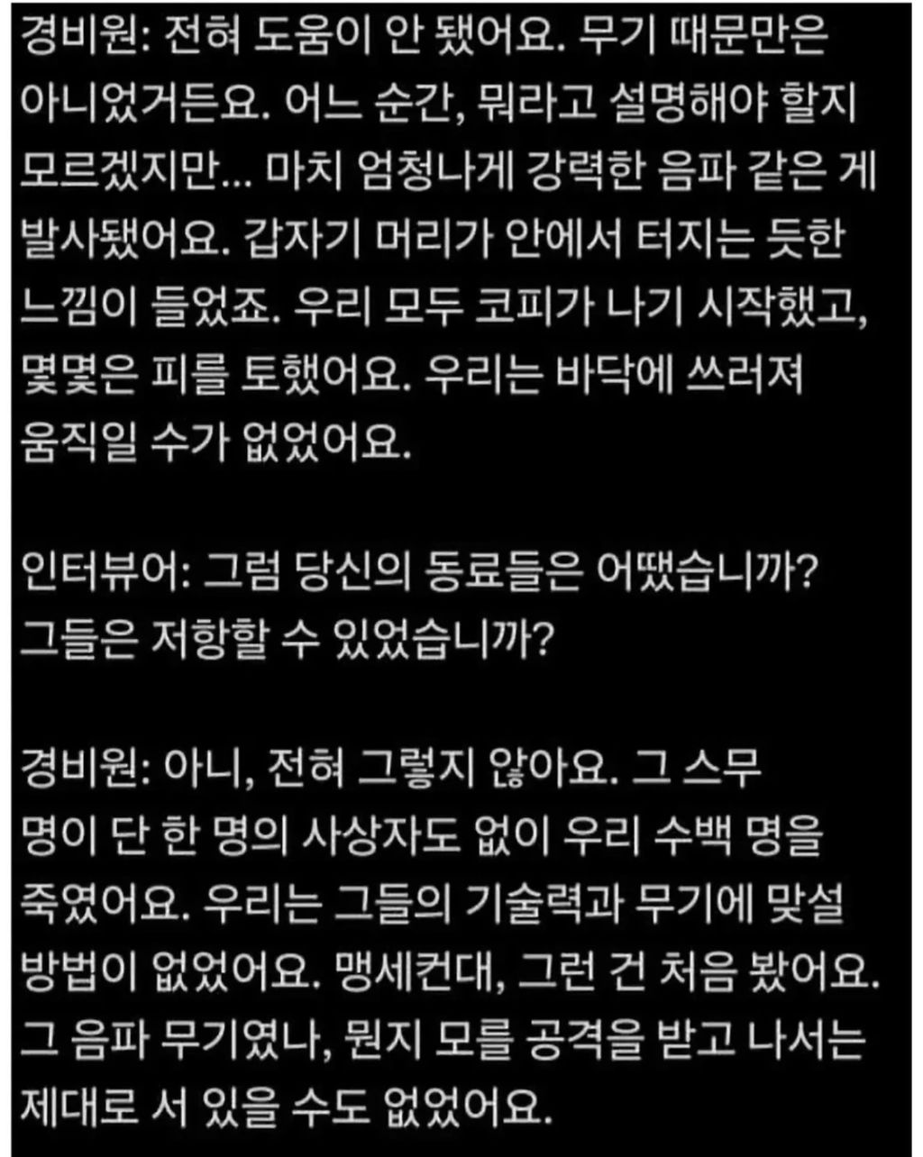 [기사]마두로 체포 당시 생존한 경비원 인터뷰ㄷㄷ 작성자반더벤|작성시간26.01.15|조회수8,659 목록 댓글 9 글자크기 작게가 글자크기 크게가 공개되지않은 신무기 사용했을 가능성이 큰ㄷㄷ 다음검색 현재 게시글 추가 기능 열기 북마크 공유하기 신고 센터로 신고 댓글 댓글 9 댓글쓰기 답글쓰기 댓글 리스트 작성자Tensegrity Universe and Philosophy | 작성시간 26.01.15 신무기일 수도 있고 거짓말일 수도.. 작성자가을날4 | 작성시간 26.01.15 음파무기 썼다고 증언이 나오네요. 작성자Totti | 작성시간 26.01.15 걍 섬광탄 보고 착각일수도? 작성자cloud | 작성시간 26.01.15 그것도 그런데 수백명의 사상자가라.. 작성자호놀롤루달팽이 | 작성시간 26.01.15 대북확성기 빌려간거 아녀? 댓글 전체보기
