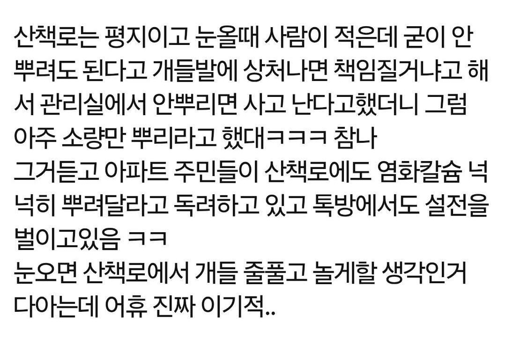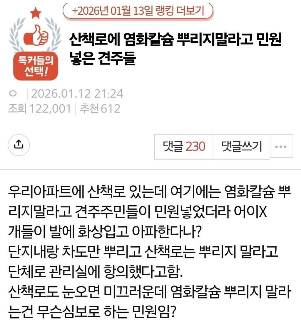작성자아일릿 작성시간 26.01.15 보통 저딴 민원 넣는 견주들 소형견 of 소형견들 키우는게 대부분인데 요즘 날씨엔 사실 산책 안해주는게 나음 영하온도때는 소형견 산책이 더 건강에 안좋은거 모른다에 100%임
