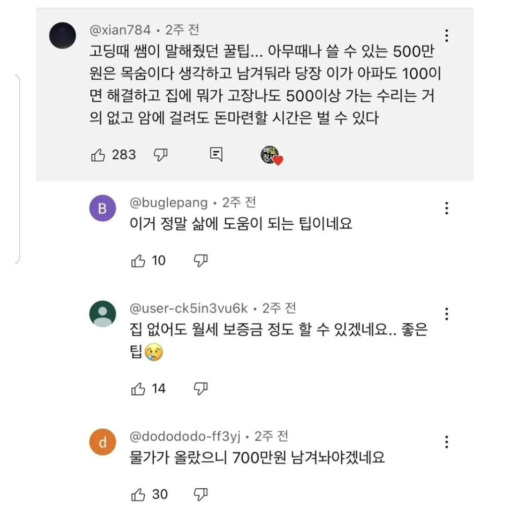 고딩 때 선생님이 말해준 꿀팁 작성자가을날4|작성시간26.01.15|조회수5,791 목록 댓글 4 글자크기 작게가 글자크기 크게가 다음검색 현재 게시글 추가 기능 열기 북마크 공유하기 신고 센터로 신고 댓글 댓글 4 댓글쓰기 답글쓰기 댓글 리스트 작성자맨위 | 작성시간 26.01.15 그래서 아들돌반지 안팔고 냅두고있응 진짜 힘들때쓸려고 작성자갰랍랍 | 작성시간 26.01.15 그 500으로 주식을 하면 어떨까 답댓글 작성자우영미 | 작성시간 26.01.15 250만원이 되는 기적 작성자박보노 | 작성시간 26.01.15 목걸이 차고 다니지 말까,, 3배가 올랐는데 댓글 전체보기