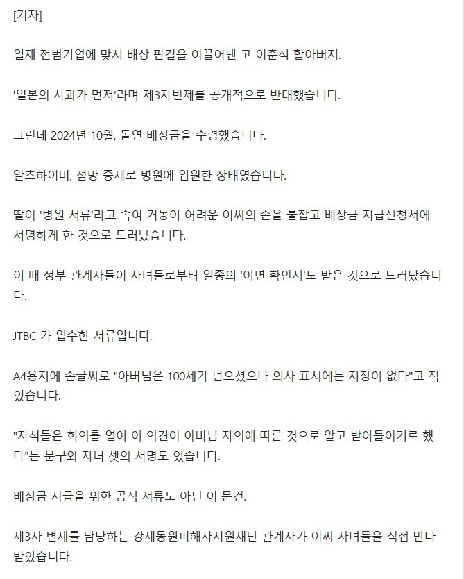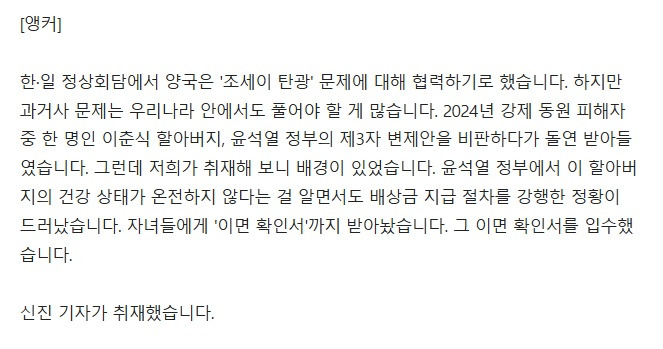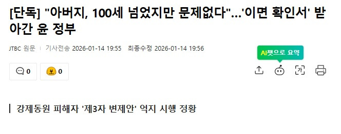 [기사][단독] "아버지, 100세 넘었지만 문제없다"…'이면 확인서' 받아간 윤 정부 작성자음교수2|작성시간26.01.15|조회수1,779 목록 댓글 6 글자크기 작게가 글자크기 크게가 https://news.nate.com/view/20260114n36932?isq=11000&mid=n0203 다음검색 현재 게시글 추가 기능 열기 북마크 공유하기 신고 센터로 신고 댓글 댓글 6 댓글쓰기 답글쓰기 댓글 리스트 작성자Terry | 작성시간 26.01.15 그저 친일반민족만 하던 시기였다 하 작성자트렌트 알렉산더 아놀드66 | 작성시간 26.01.15 와.... 작성자난누군가또여긴어딘가. | 작성시간 26.01.15 친일정부와 부친의 신념은 돈 앞에 무용있었던 자식들의 합작.... 작성자I.B.I LUV | 작성시간 26.01.15 매국노 짓을 거리낌 없이 했네? 작성자Andrea Pirlo 21 | 작성시간 26.01.15 하... 댓글 전체보기