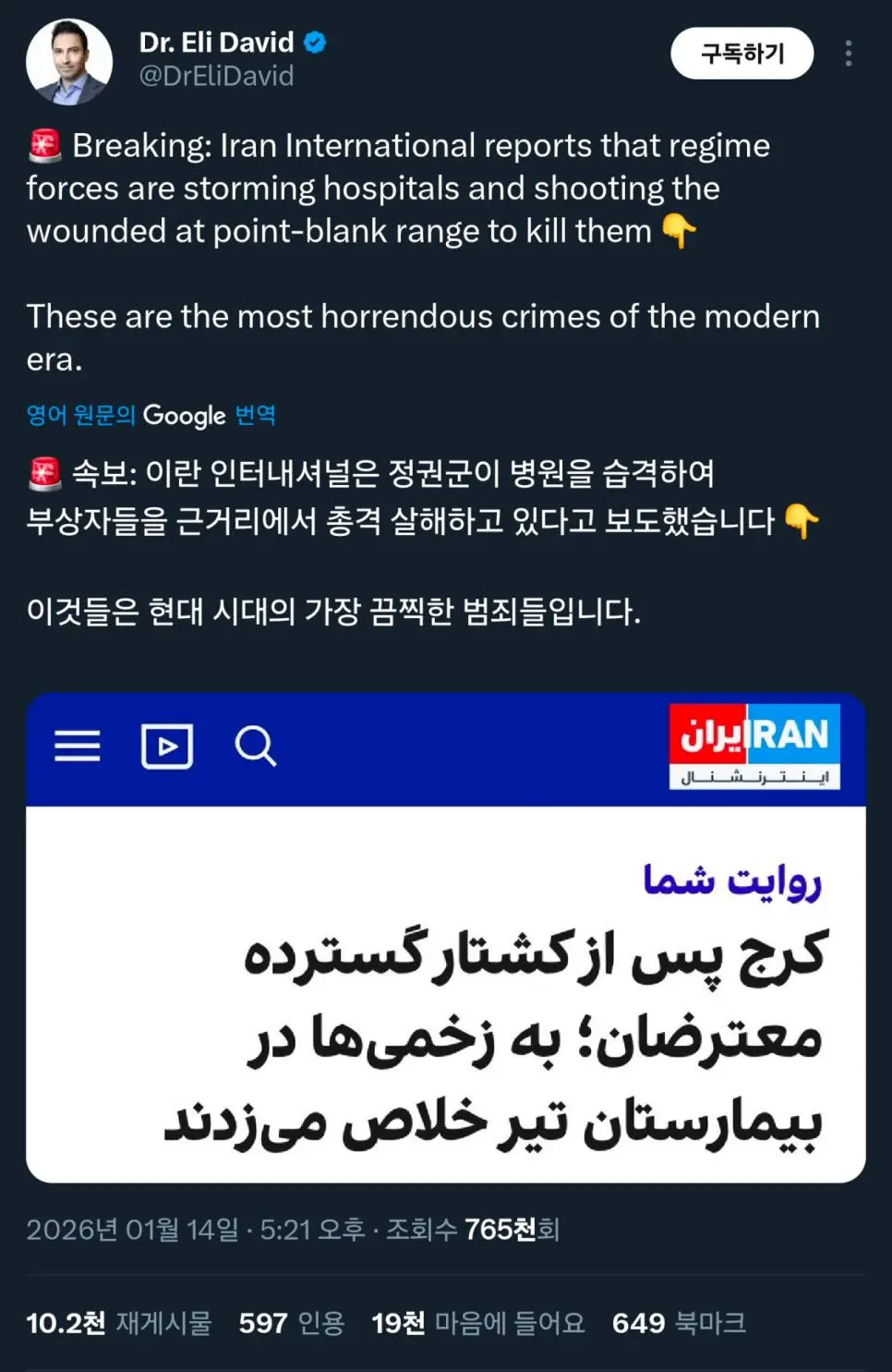 [정치][속보]이란군, 병원 습격해 부상자들 하나하나 살해.jpg 작성자강동구주민 3|작성시간26.01.15|조회수24,686 목록 댓글 53 글자크기 작게가 글자크기 크게가 다음검색 현재 게시글 추가 기능 열기 북마크 공유하기 신고 센터로 신고 댓글 댓글 53 댓글쓰기 답글쓰기 댓글 리스트 작성자중고차파괴자 | 작성시간 26.01.15 우리도 계엄됐으면 ㅇㅈㄹ날뻔했음 휴 작성자밀키스 | 작성시간 26.01.16 ㅁㅊ ㄷㄷ 작성자김지우 | 작성시간 26.01.16 미쳤네 작성자아저씨 | 작성시간 26.01.16 ㅁㅊ 작성자음악대학 | 작성시간 26.01.16 사람 새끼들이 아니네 댓글 전체보기