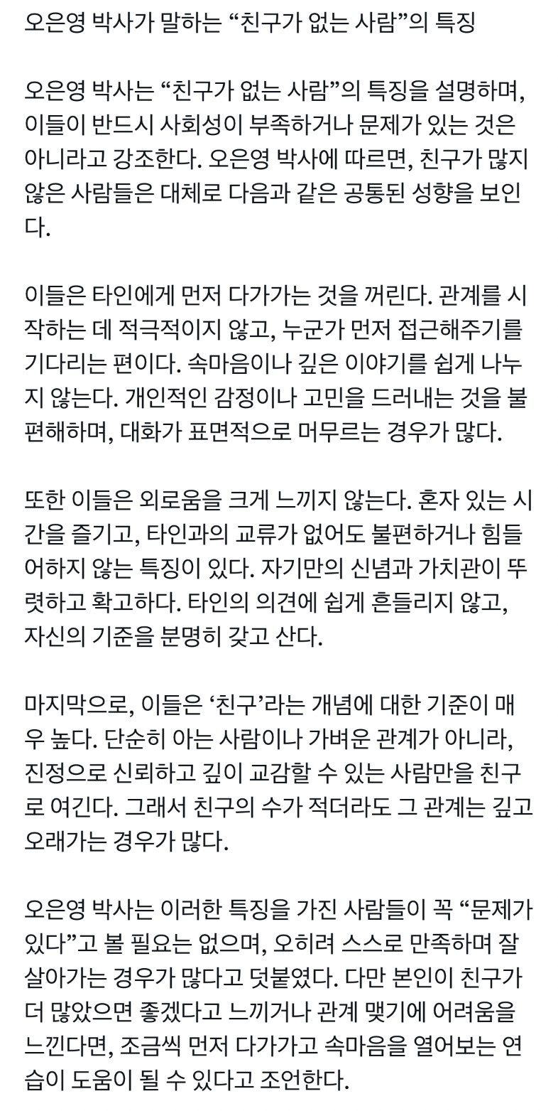 작성자훈이 작성시간 26.01.16 마지막이 좀 다르네요 저랑. 친구라는 개념의 기준이 높은게 아니라 그냥 '친구=서로 원할때 같이 놀고 시간보낼 수 있는 사람' 정도라 그렇게 많이 필요하지도 않고, 많아봐야 관계유지에 들어가는 에너지가 너무 불필요하게 많아짐