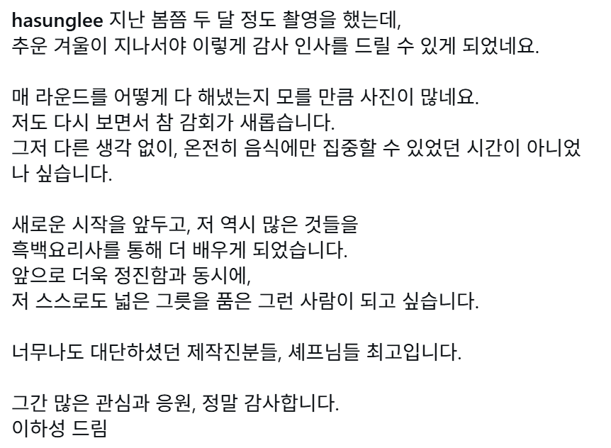 [SNS]흑백요리사2 요리괴물 인스타 소감문 작성자서스날|작성시간26.01.16|조회수7,193 목록 댓글 9 글자크기 작게가 글자크기 크게가 https://www.instagram.com/p/DThWlsxDmgu/?utm_source=ig_web_copy_link&igsh=MzRlODBiNWFlZA== 다음검색 현재 게시글 추가 기능 열기 북마크 공유하기 신고 센터로 신고 댓글 댓글 9 댓글쓰기 답글쓰기 댓글 리스트 작성자추워추워추워추워 | 작성시간 26.01.16 진짜 실력자같았음 작성자듀레 | 작성시간 26.01.16 이 분의 아스파라거스 먹어보고싶음 작성자뿌앵카레 정식 | 작성시간 26.01.16 자의는 아니였지면 최고의 빌런 역할이였음 작성자Tensegrity Universe and Philosophy | 작성시간 26.01.16 작성자코비 마이누 | 작성시간 26.01.16 실력만보면 시즌1,2포함 흑수저중에선 최고같음 ㄷㄷ 댓글 전체보기
