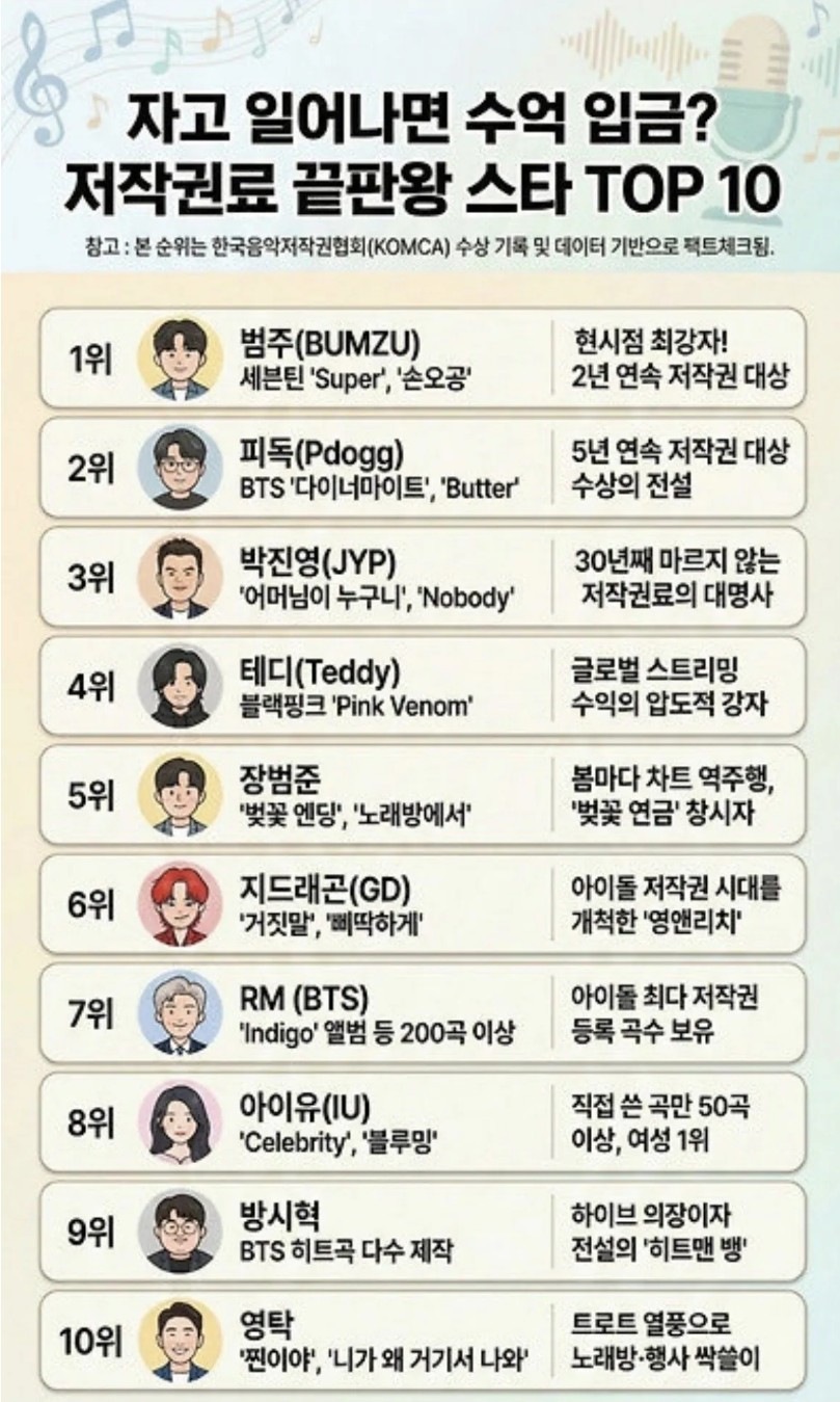 대한민국 저작권료 TOP 10 작성자ChatGPT|작성시간26.01.16|조회수7,046 목록 댓글 13 글자크기 작게가 글자크기 크게가 다음검색 현재 게시글 추가 기능 열기 북마크 공유하기 신고 센터로 신고 댓글 댓글 13 댓글쓰기 답글쓰기 댓글 리스트 작성자데니스 코펜하겐 | 작성시간 26.01.16 영탁이 10위라고?? 작성자보글 | 작성시간 26.01.17 이상하네? 작성자시티즌 유 | 작성시간 26.01.17 와 계범주 ㄷㄷㄷ 작성자그리스청국장 | 작성시간 26.01.17 박진영?노바디는 그렇다쳐도 어머님이~는 좀 아닌거 같은데 작성자I.B.I LUV | 작성시간 26.01.17 가만히 있어도 돈이 들어오는 야..... 댓글 전체보기