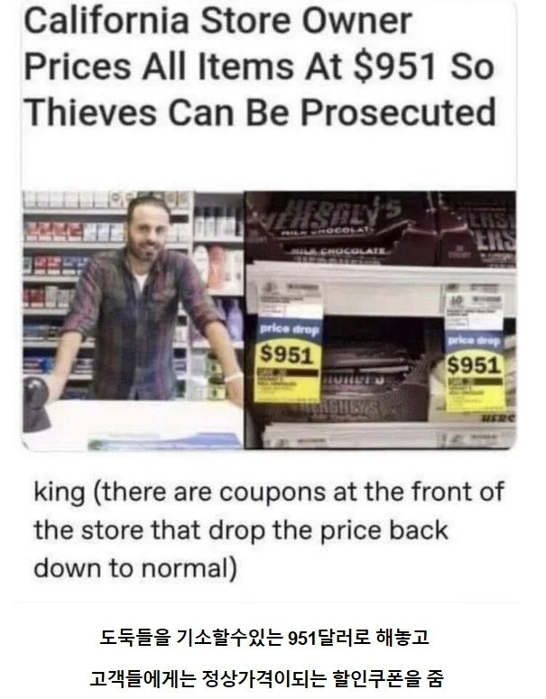 [기타]모든 물건이 951달러(120만원)인 가게 작성자음교수2|작성시간26.01.16|조회수16,261 목록 댓글 2 글자크기 작게가 글자크기 크게가 캘리포니아에서 감옥 자리없다고1000달러 이하 금액에 상당하는 절도는경범죄로 훈방하는 말도 안되는 법안을 시행하기 때문임 다음검색 현재 게시글 추가 기능 열기 북마크 공유하기 신고 센터로 신고 댓글 댓글 2 댓글쓰기 답글쓰기 댓글 리스트 작성자오스먼트 | 작성시간 26.01.16 오 특이하네요 ㅋㅋ 작성자아메리카노 | 작성시간 26.01.16 ㅋㅋㅋㅋㅋㅋㅋ 댓글 전체보기