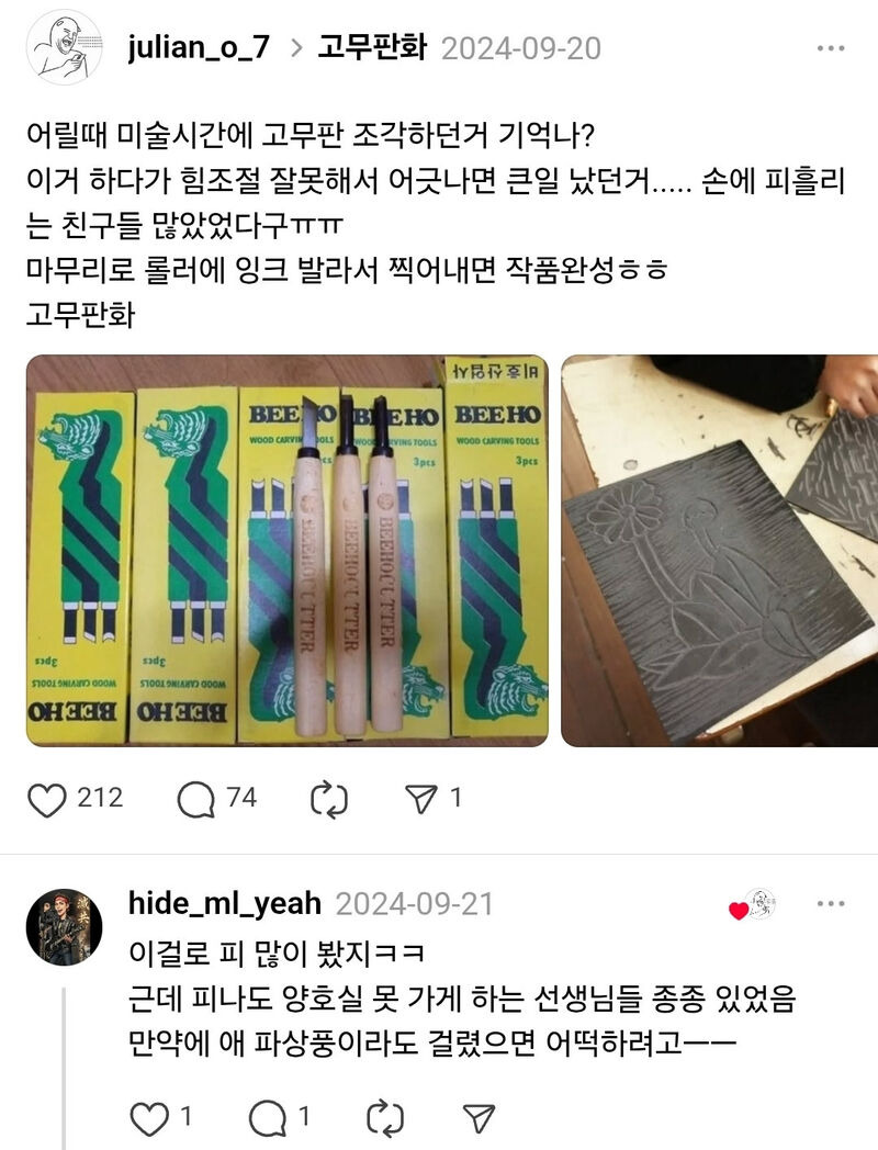 지금이라면 어림도 없을 미술 수행평가 작성자Google|작성시간26.01.17|조회수5,669 목록 댓글 14 글자크기 작게가 글자크기 크게가 https://humoruniv.com/pds1397037 다음검색 현재 게시글 추가 기능 열기 북마크 공유하기 신고 센터로 신고 댓글 댓글 14 댓글쓰기 답글쓰기 댓글 리스트 작성자곰 갈매기 프로미 스파이더 | 작성시간 26.01.17 동판화는 심지어 나중에 부식도 시켜야함. 작성자하파엘 Leao | 작성시간 26.01.17 기억난다 추억.. 작성자Clarence Seedorf | 작성시간 26.01.17 개위험해 작성자PinkMoon | 작성시간 26.01.17 내동생도 같이 팽이만들다 손가락 하나 잘릴뻔함 작성자Inter | 작성시간 26.01.17 저걸로 책상에 구멍 뚫고 그랬는데 댓글 전체보기