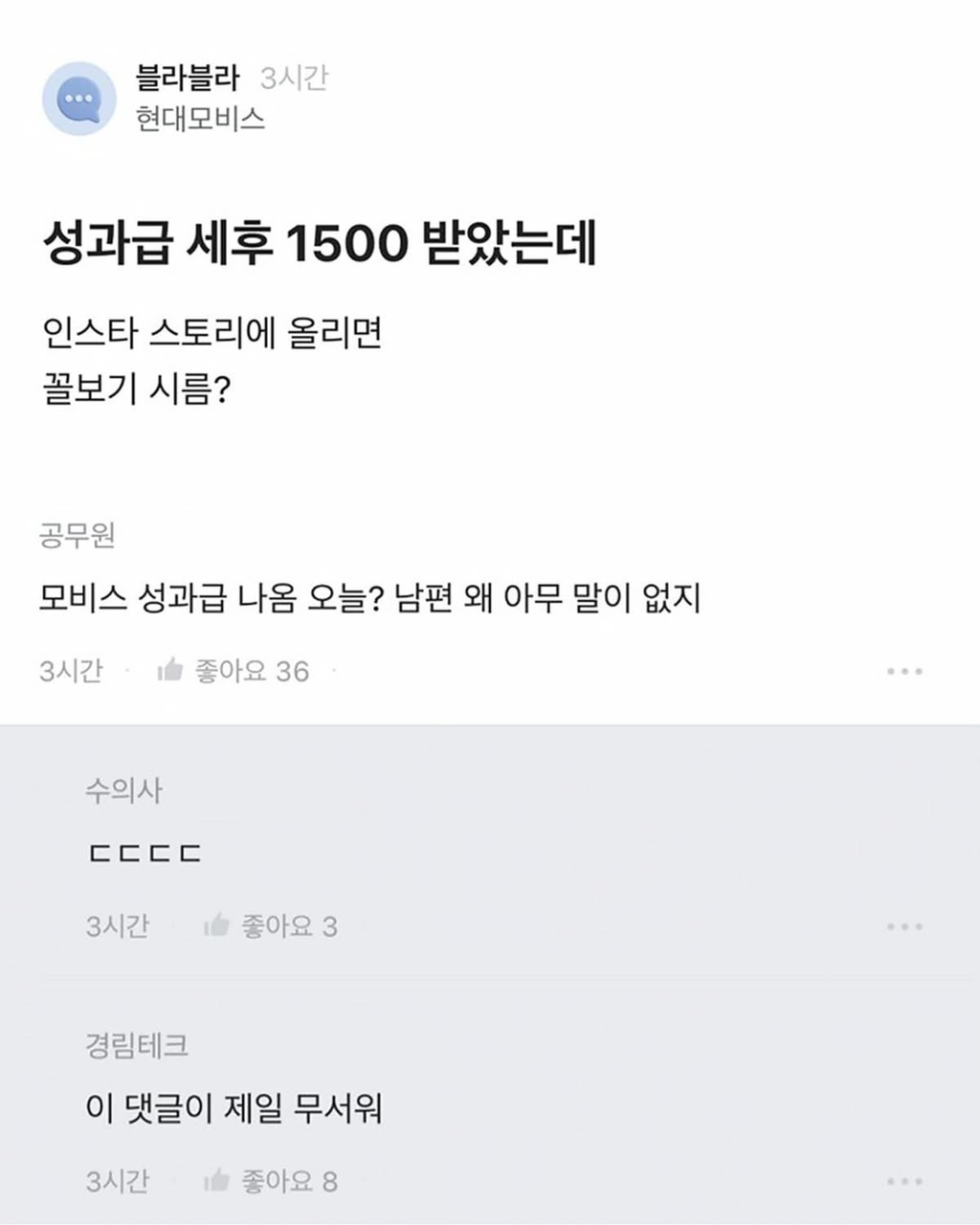 블라) 성과급 1500 받았는데 인스타 올려도 되나? 작성자가을날4|작성시간26.01.18|조회수7,530 목록 댓글 1 글자크기 작게가 글자크기 크게가 다음검색 현재 게시글 추가 기능 열기 북마크 공유하기 신고 센터로 신고 댓글 댓글 1 댓글쓰기 답글쓰기 댓글 리스트 작성자채화 | 작성시간 26.01.18 ㅋㅋㅋㅋㅋㅋㅋㅋㅋㅋㅋㅋㅋㅋㅋㅋㅋㅋㅋㅋ 댓글 전체보기