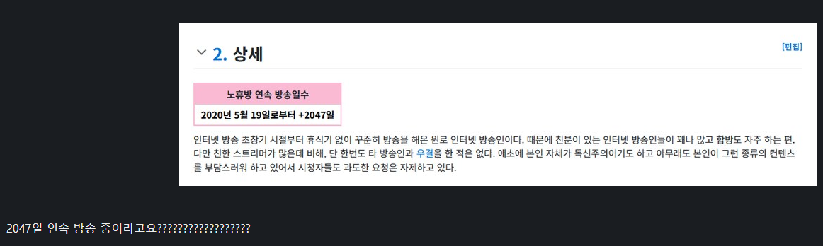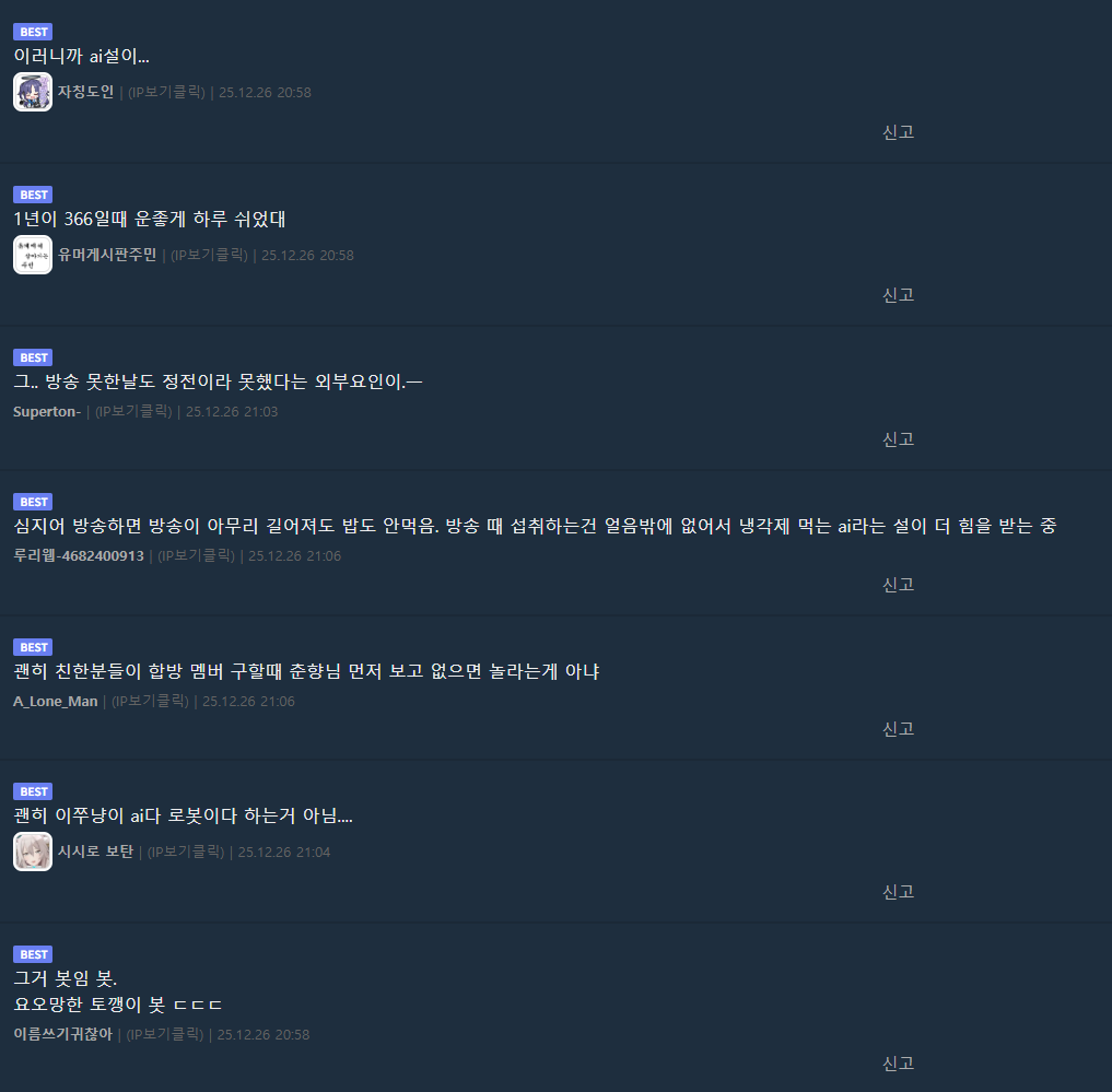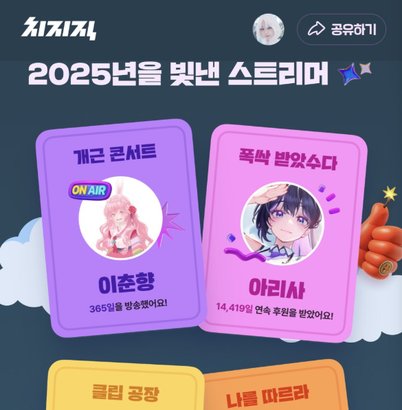 [인방]2025년을 빛낸 치지직 스트리머 가운데.. 작성자인쿠시|작성시간26.01.18|조회수998 목록 댓글 3 글자크기 작게가 글자크기 크게가 치지직 스트리머 '이춘향'1년 365일 중 365일 방송..ㄷㄷ 보다 놀라운건 2047일 연속 방송중 ㄷㄷㄷㄷ 다음검색 현재 게시글 추가 기능 열기 북마크 공유하기 신고 센터로 신고 댓글 댓글 3 댓글쓰기 답글쓰기 댓글 리스트 작성자램지호구 | 작성시간 26.01.18 이춘향은 방송을 안하고 있어도 다른 사람이 방송에서 언급하면 채팅을 친다는 무서운 얘기가 있다... 작성자슈팅라이크종수 | 작성시간 26.01.18 이쭈냥이 휴방을 안하는 이유 ㅎhttps://www.youtube.com/watch?v=_a1nFErdb90 동영상 작성자H_Crespo | 작성시간 26.01.18 ㅎㄷㄷ 댓글 전체보기
