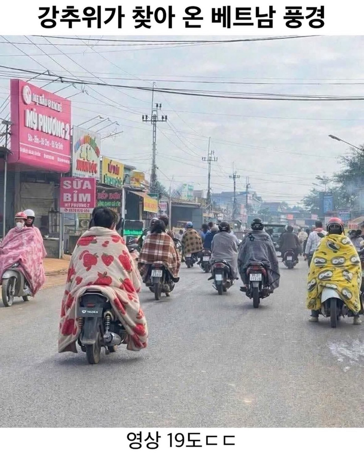 [유머]한파주의보 떨어진 베트남.jpg 작성자Real Reds|작성시간26.01.19|조회수8,030 목록 댓글 10 글자크기 작게가 글자크기 크게가 다음검색 현재 게시글 추가 기능 열기 북마크 공유하기 신고 센터로 신고 댓글 댓글 10 댓글쓰기 답글쓰기 댓글 리스트 작성자WingsGoal | 작성시간 26.01.19 한자리수 되면 얼어죽겠네 ㄷㄷ 작성자JTBC | 작성시간 26.01.19 저러고 오토바이타면 위험할거같은데 작성자토로로쀼뀨 | 작성시간 26.01.19 근데 오토바이 타면 바람 쎄게 불어서 춥긴해요 ㅋㅋㅋ저 친구들은 진짜 추울거에요 작성자이나경 | 작성시간 26.01.20 작성자스토이코비치 | 작성시간 26.01.20 베트남에서 6개월 있었는데 우리는 반팔입고 쟤네는 패딩입고...ㅎㄷㄷㄷ 댓글 전체보기