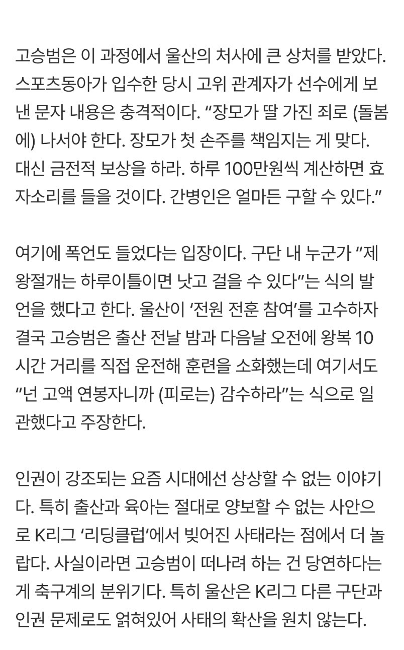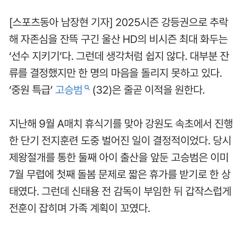 [축구기사]‘출산 사건’ 그 후 마음 떠난 고승범, 울산과 동행은 지속될 수 있을까? 작성자solid|작성시간26.01.20|조회수5,462 목록 댓글 13 글자크기 작게가 글자크기 크게가 https://m.sports.naver.com/kfootball/article/382/0001249165‘출산 사건’ 그 후 마음 떠난 고승범, 울산과 동행은 지속될 수 있을까?여기를 눌러 링크를 확인하세요m.sports.naver.com 다음검색 현재 게시글 추가 기능 열기 북마크 공유하기 신고 센터로 신고 댓글 댓글 13 댓글쓰기 답글쓰기 댓글 리스트 답댓글 작성자즈믄가람 | 작성시간 26.01.20 묘느리미나리 앞에서는 팬프렌들리 어쩌고 하더니… 인간도 아니네요. 답댓글 작성자King of asia ULSAN | 작성시간 26.01.20 즈믄가람 우리는 본업이지만 너희들 취미 아니냐?노조는 악이다 실화입니다 답댓글 작성자잉어붕어 | 작성시간 26.01.20 묘느리미나리 누군가여? 작성자The theatre of dreams | 작성시간 26.01.20 작성자지중해 | 작성시간 26.01.20 다른팀 가는 게 맞죠.. 댓글 전체보기