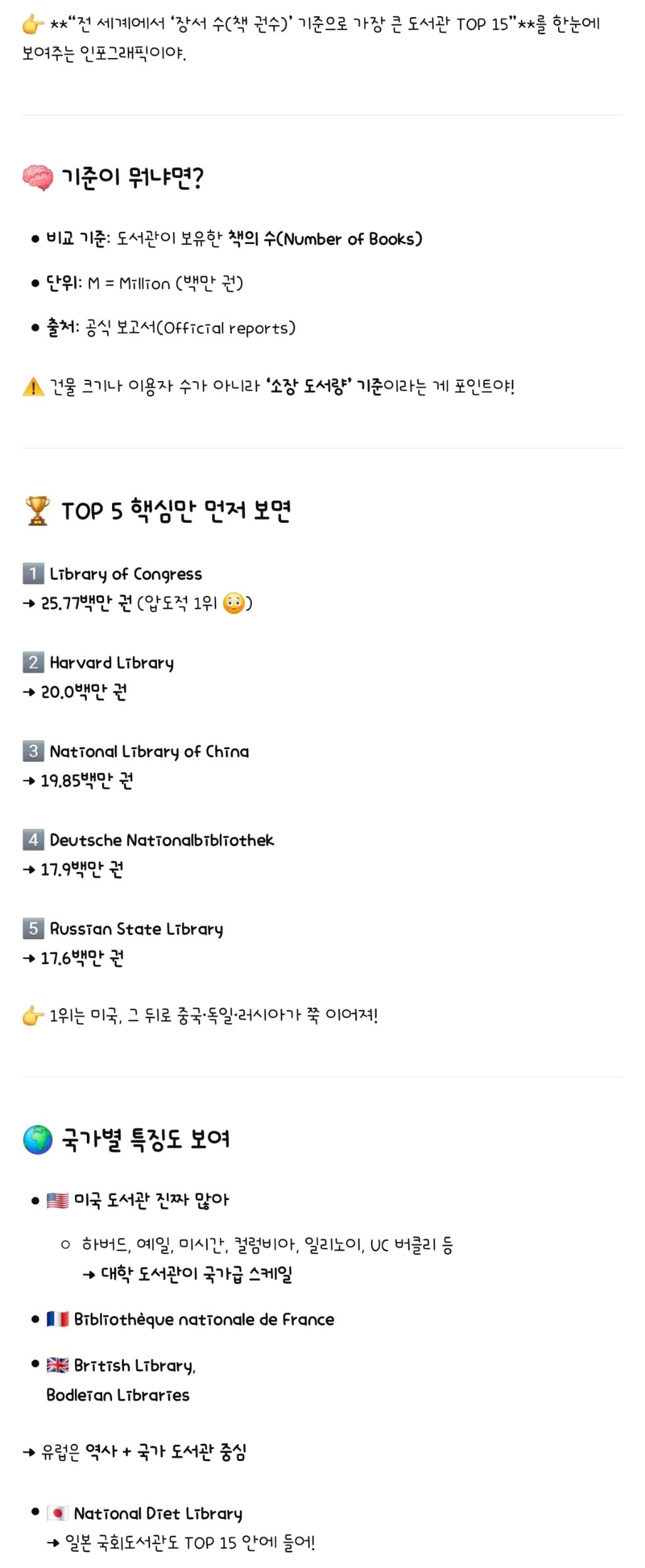 세계에서 큰 도서관 순위 작성자ChatGPT|작성시간26.01.20|조회수4,821 목록 댓글 2 글자크기 작게가 글자크기 크게가 다음검색 현재 게시글 추가 기능 열기 북마크 공유하기 신고 센터로 신고 댓글 댓글 2 댓글쓰기 답글쓰기 댓글 리스트 작성자아메리카노 | 작성시간 26.01.20 ㄷㄷ 작성자Tensegrity Universe and Philosophy | 작성시간 26.01.20 오옹.. diet의 다른 뜻을 오늘 하나 알게되었네요. 댓글 전체보기