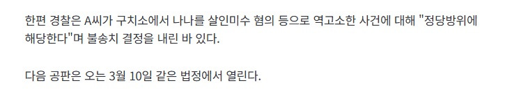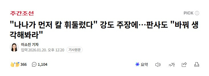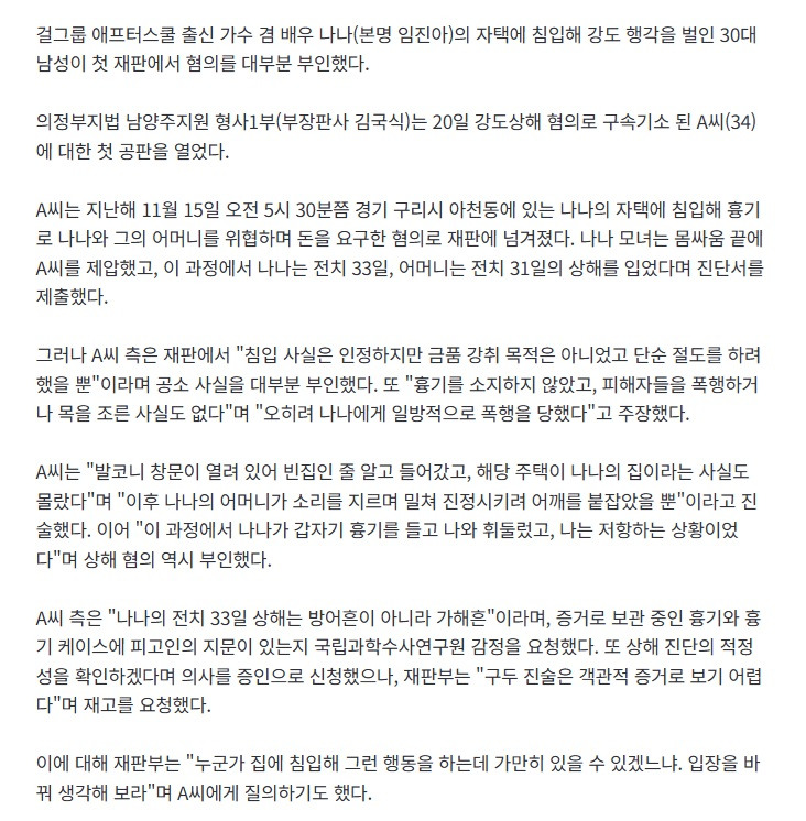[연예]"나나가 먼저 칼 휘둘렀다" 강도 주장에…판사도 "바꿔 생각해봐라" 작성자음교수2|작성시간26.01.21|조회수7,141 목록 댓글 31 글자크기 작게가 글자크기 크게가 https://n.news.naver.com/article/053/0000055171 다음검색 현재 게시글 추가 기능 열기 북마크 공유하기 신고 센터로 신고 댓글 댓글 31 댓글쓰기 답글쓰기 댓글 리스트 작성자Xabi Alonso | 작성시간 26.01.21 발코니가 열려있다고 들어가는게 정상이냐;;; 작성자Vicario | 작성시간 26.01.21 진짜 이런 찐따같은게ㅋㅋ할말이 없네 작성자메리다 | 작성시간 26.01.21 방석이라도 깔아줘야 되냐 그럼 ㅋㅋ 작성자허니버터고구마 | 작성시간 26.01.21 미친건가 진짜 생각하는 수준이 다르네 작성자I.B.I LUV | 작성시간 26.01.21 너는 감형 없겠다.... ㅋㅋㅋㅋ ㅅㄱ 댓글 전체보기