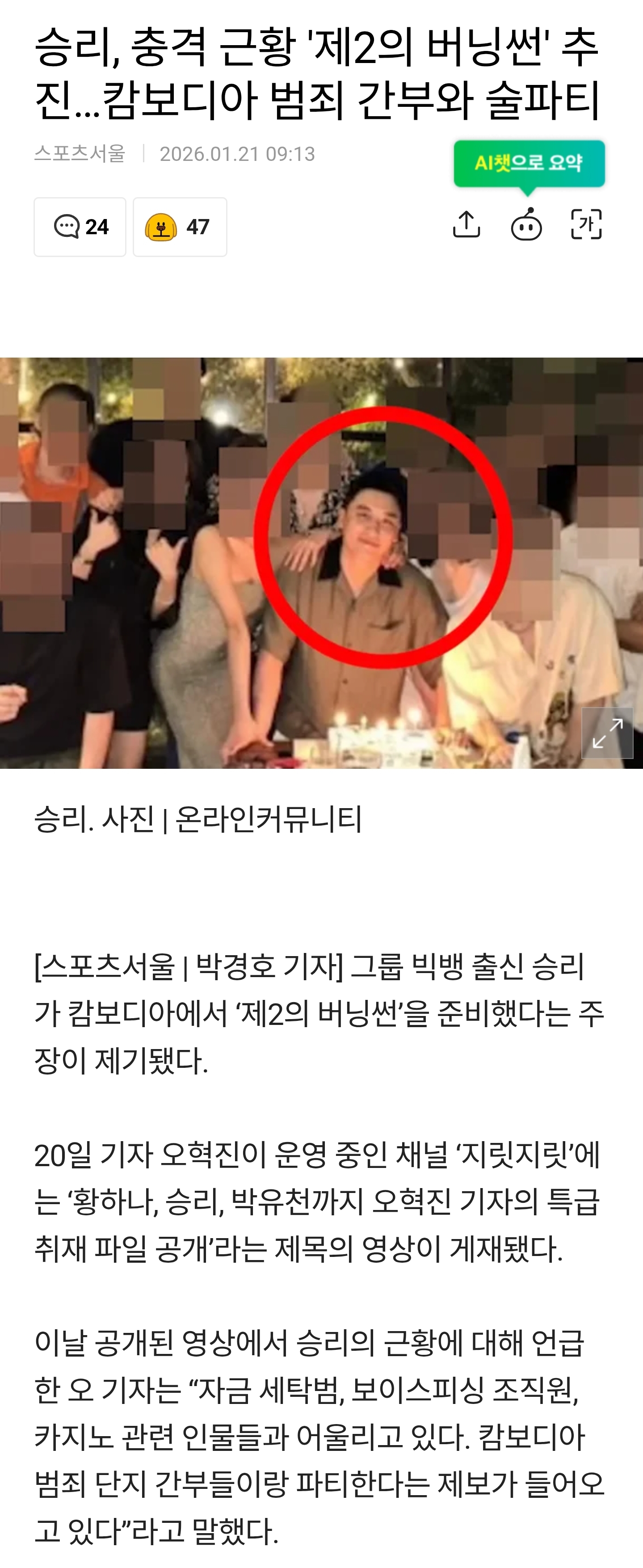 [연예]승리, 충격 근황 '제2의 버닝썬' 추진…캄보디아 범죄 간부와 술파티 작성자뷔정국진지민|작성시간26.01.21|조회수15,904 목록 댓글 17 글자크기 작게가 글자크기 크게가 https://m.news.nate.com/view/20260121n07207?mid=e02승리, 충격 근황 '제2의 버닝썬' 추진…캄보디아 범죄 간부와 술파티 : 네이트 연예한눈에 보는 오늘 : 방송/가요 - 뉴스 : 승리. 사진 | 온라인커뮤니티 [스포츠서울 | 박경호 기자] 그룹 빅뱅 출신 승리가 캄보디아에서 ‘제2의 버닝썬’을 준비했다는 주장이 제기됐다. 20일 기자m.news.nate.com 다음검색 현재 게시글 추가 기능 열기 북마크 공유하기 신고 센터로 신고 댓글 댓글 17 댓글쓰기 답글쓰기 댓글 리스트 작성자아오테아로아 | 작성시간 26.01.21 얘는 조만간 총맞아 죽었다는 소식도 가능할거같은데ㄷㄷ 작성자피버노바 | 작성시간 26.01.21 리얼 개쓰레기 ㅋ 작성자I.B.I LUV | 작성시간 26.01.21 쟤도 부고 소식만 듣고 싶다 작성자메리다 | 작성시간 26.01.21 차라리 개가 똥을 끊지 ㅋㅋㅋㅋㅋ 작성자Bad to the Bone | 작성시간 26.01.22 쟤는 언젠가 살해당할지도 모름 댓글 전체보기