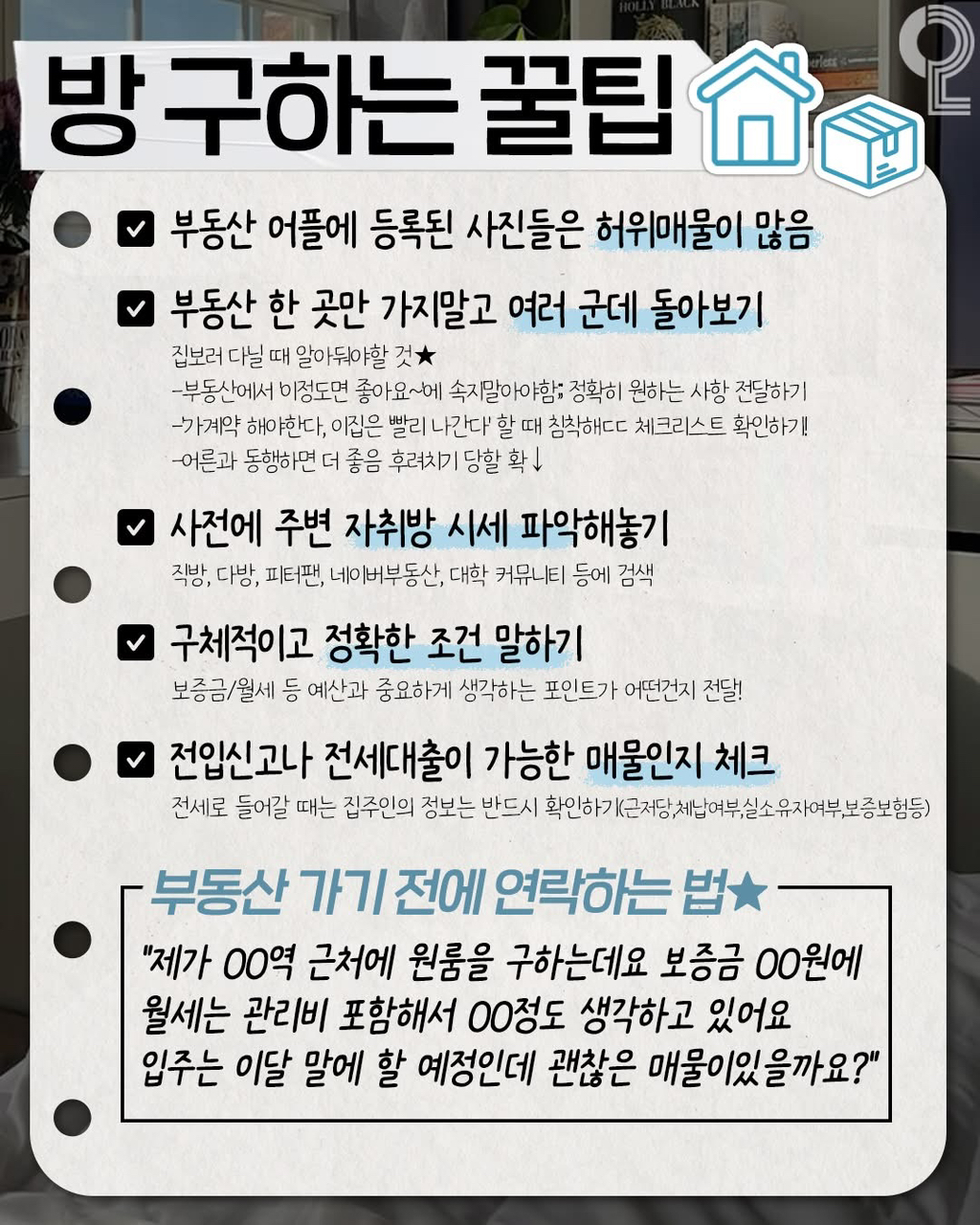 자취방 구하기 꿀팁 총 정리 작성자가을날4|작성시간26.01.21|조회수4,453 목록 댓글 12 글자크기 작게가 글자크기 크게가 * 세부사항은 본인이 꼭 필히 확인출처 20대뭐하지 다음검색 현재 게시글 추가 기능 열기 북마크 공유하기 신고 센터로 신고 댓글 댓글 12 댓글쓰기 답글쓰기 댓글 리스트 작성자박보노 | 작성시간 26.01.21 어떤 전문가는 부동산 여러곳 가지말라던데,,, 집 주인이 여러곳에 올려서 수요가 있다는걸 알고 가격올린다고 작성자데이비드베컴 | 작성시간 26.01.21 자취방 작성자구름은 | 작성시간 26.01.21 원룸 자취방 작성자총알로벤 | 작성시간 26.01.21 유부남인 나는 왜보고있는건가 ㅎㅎ 작성자포메찡 | 작성시간 26.01.21 청년이사비 지원 될려나 ?신청 해본적은 없지만 댓글 전체보기