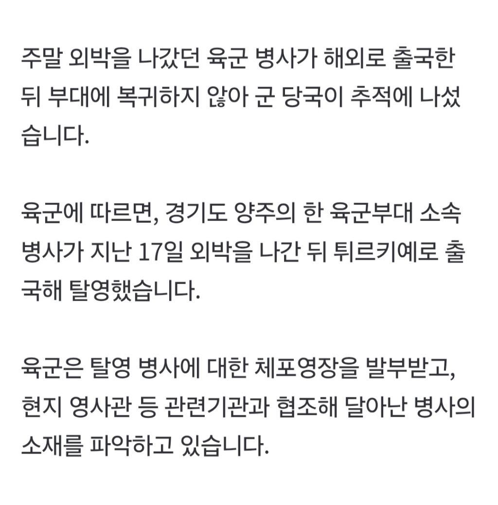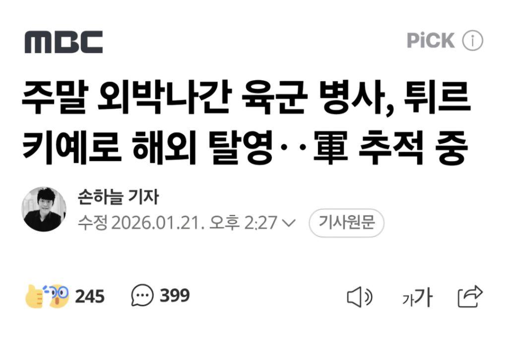[기사]주말 외박나간 육군 병사, 튀르키예로 해외 탈영‥軍 추적 중 작성자음교수2|작성시간26.01.21|조회수8,993 목록 댓글 27 글자크기 작게가 글자크기 크게가 https://n.news.naver.com/article/214/0001475671 다음검색 현재 게시글 추가 기능 열기 북마크 공유하기 신고 센터로 신고 댓글 댓글 27 댓글쓰기 답글쓰기 댓글 리스트 작성자ČECH | 작성시간 26.01.21 머리심으러갔나 ㅋㅋㅋ예전에 나 있던 부대서도 이탈리아인가 어디로 도망갔다가 잡혔는데 답댓글 작성자발렌시아 | 작성시간 26.01.21 광규야, 머리 심어라잉 작성자밀키스 | 작성시간 26.01.21 이게되네 ㄷㄷ 작성자Pringles | 작성시간 26.01.22 지 팔자 지가 꼬는 방법도 가지가지다.. 작성자I.B.I LUV | 작성시간 26.01.22 어쩜 도망갈 생각을 하냐......... 댓글 전체보기