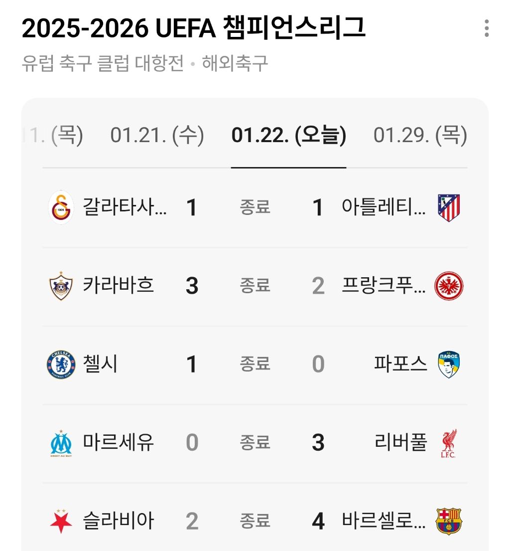 [25-26 UEFA 챔피언스리그] 오늘자 리그 페이즈 매치데이7 경기 결과 및 순위 작성자Hailee Steinfeld|작성시간26.01.22|조회수1,219 목록 댓글 2 글자크기 작게가 글자크기 크게가 다음검색 현재 게시글 추가 기능 열기 북마크 공유하기 신고 센터로 신고 댓글 댓글 2 댓글쓰기 답글쓰기 댓글 리스트 작성자H_Crespo | 작성시간 26.01.22 16강 직행 8팀은 어디가 될것인지. 턱걸이로 플옵가는 팀은 어디가 될것인지. 작성자흑마 | 작성시간 26.01.22 헐 3위부터 아직모르네요 댓글 전체보기