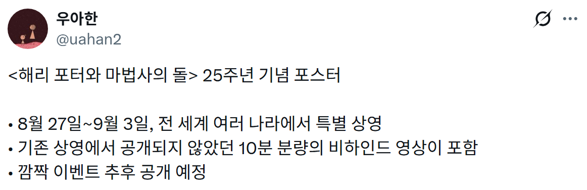 [영화]'해리 포터와 마법사의 돌' 25주년 비하인드 버전 특별 상영 예정 작성자서스날|작성시간26.01.22|조회수2,557 목록 댓글 1 글자크기 작게가 글자크기 크게가 https://x.com/uahan2/status/2014118733883769261?s=20 https://www.hollywoodreporter.com/movies/movie-news/harry-potter-25th-anniversary-warner-bros-film-celebration-1236479808/ 다음검색 현재 게시글 추가 기능 열기 북마크 공유하기 신고 센터로 신고 댓글 댓글 1 댓글쓰기 답글쓰기 댓글 리스트 작성자새벽비행 | 작성시간 26.01.22 저 배타고 성들어가는포스터 엄청 몽환적이고 좋았는데 ㅋㅋ 댓글 전체보기