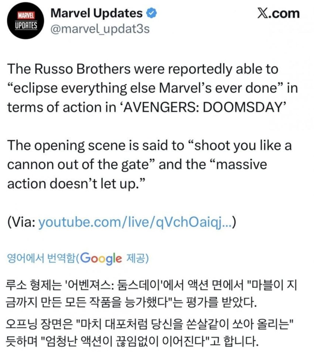'어벤져스: 둠스데이'는 액션 면에서 "마블이 지 금까지 만든 모든 작품을 능가했다"는 평가를 받았다